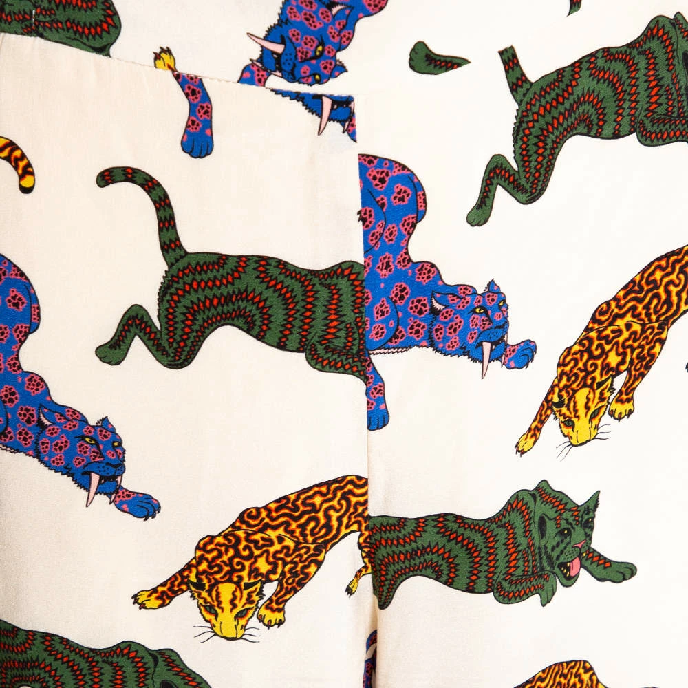 This pair of relaxed-fit cream pants from Stella McCartney is sure to bring you not just style but great comfort. It comes tailored from silk and designed with Wild Cat prints all over and an elasticized waistband.