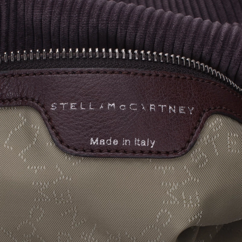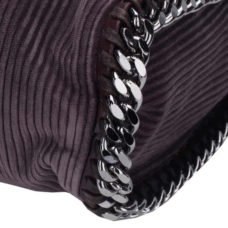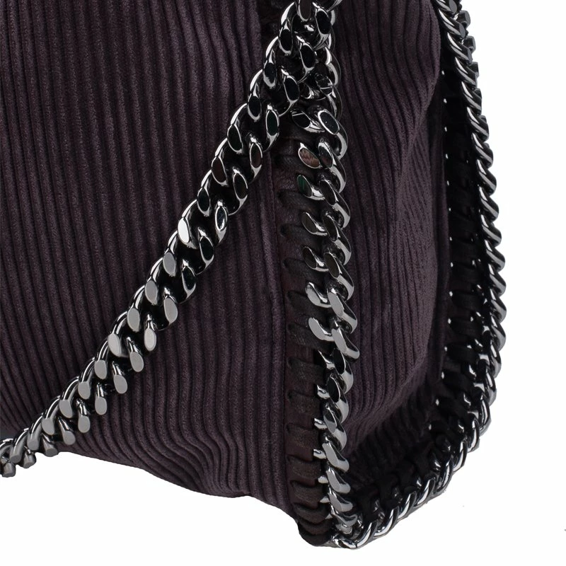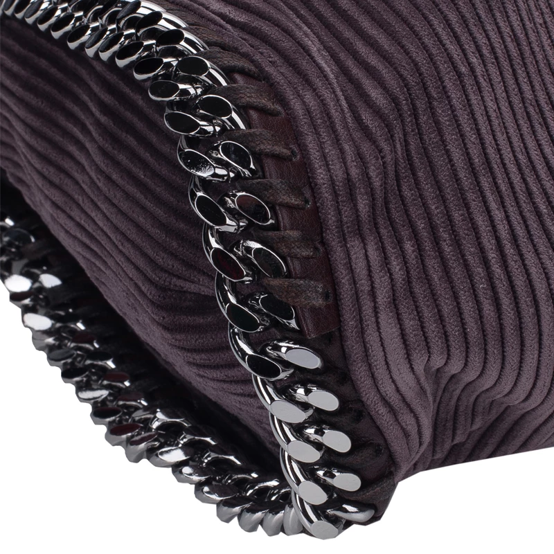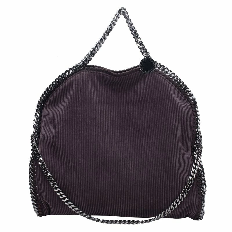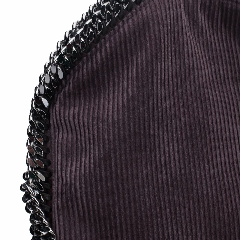 Easily add a subtle touch to your look with this Falabella tote by Stella McCartney. Made from dark purple corduroy fabric, this tote bag is framed with a whip-stitch trim, a magnetic top closure, and a designer-stamped disc charm. The interior is nylon lined and comes with a zip pocket. This tote is equipped with a silver-toned gunmetal chain top handle. A fun fact about Stella McCartney is that all her designs are โvegan friendlyโ and have absolutely no animal products in them!