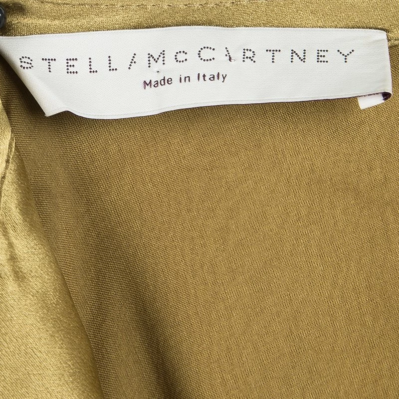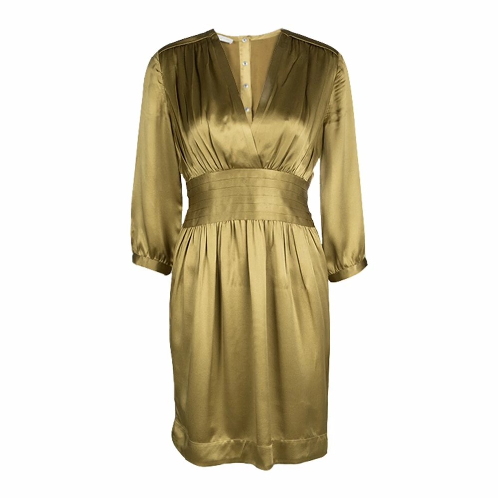 When you step out in this Stella McCartney dress, you’ll look no less than a goddess. This creation is so perfect it will not only accentuate your body but will also lift your spirits because wearing good clothes can give the wearer a pleasant feeling. In a dull gold shade, this long sleeve dress flaunts a v-neck, pleat details, with button fastenings and a tie detail at the back. Assemble the whole look with statement jewelry and strappy sandals.