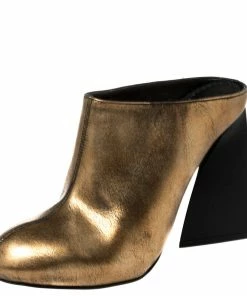 Slip into these exquisite gold mules from the house of Stella McCartney and get set to feel your best. Crafted from faux leather, they feature center stitching with no appliquรฉ fronts and no counters. Elevated on 11 cm triangular heels, they make a great purchase.