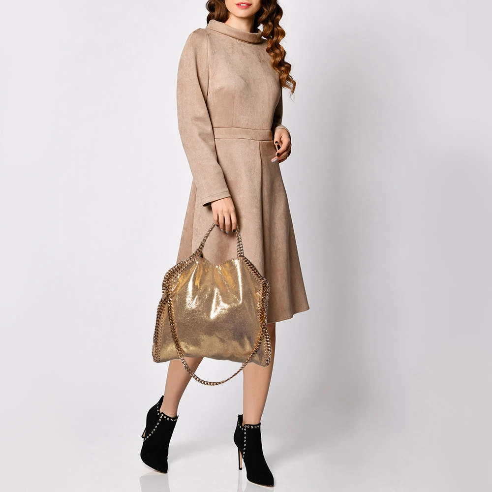 This Falabella tote from Stella McCartney is one of the most loved designs from the sustainably conscious label. Crafted from faux suede, it is durable and stylish. While the chain detailing elevate its beauty, the fabric-lined interior will dutifully hold all your daily essentials. You can swing this tote using the chain handles.