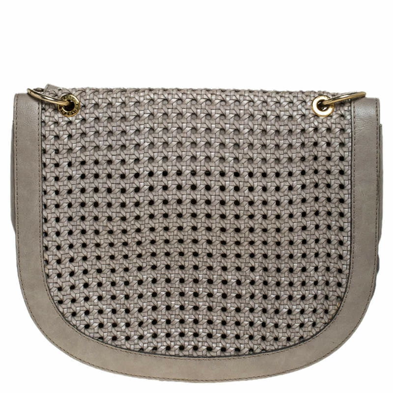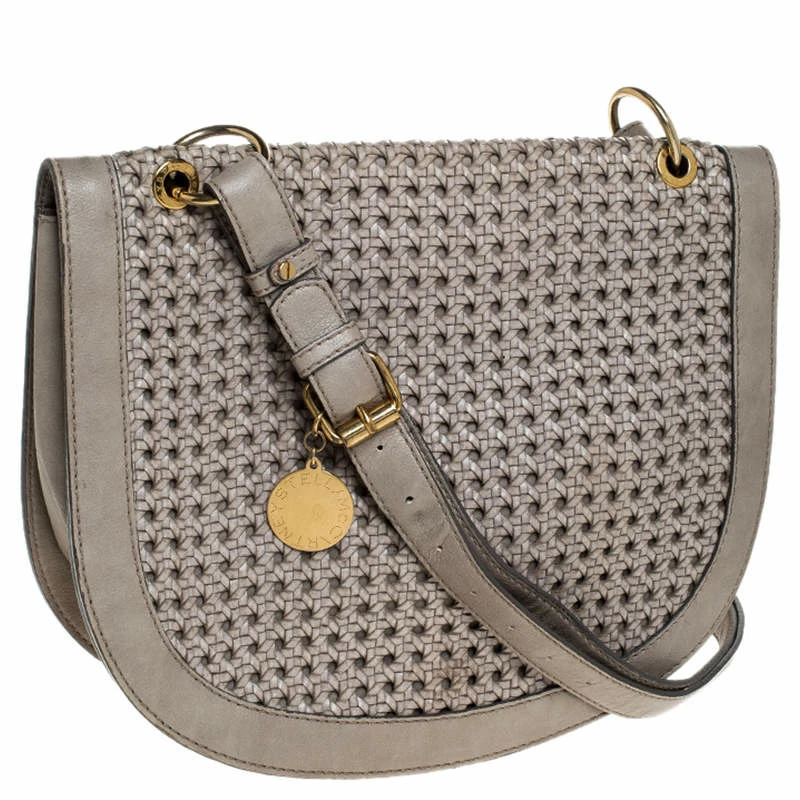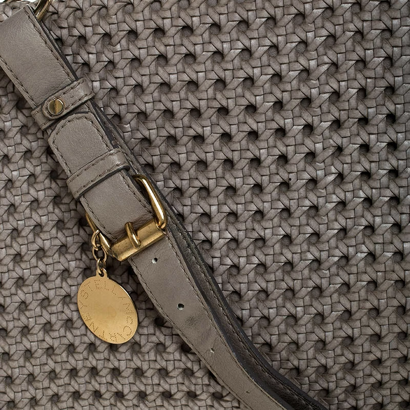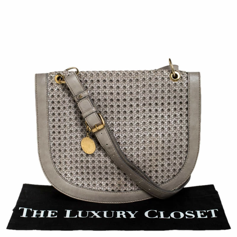 Carry this bag from Stella McCartney without compromising on style. This woven leather bag comes in a ‘U’ shape with a flap. This chic grey bag opens to a leather-lined interior and is held by a shoulder strap.