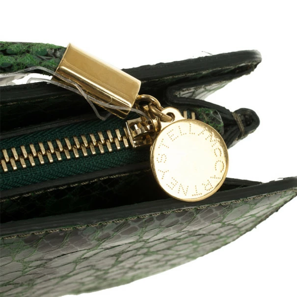 Dazzle them with this Stella McCartney Loretta ‘Waverly’ Exotic Skins Patchwork Green Clutch. With its patchwork design and wrist strap with gold-tone Stella McCartney logo, this stunning clutch is equipped with two patch pockets and a central zip pocket. Original Retail Price: US $1,000