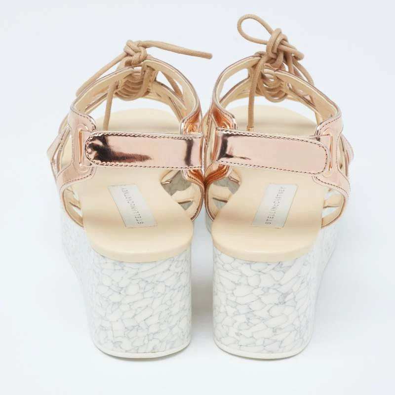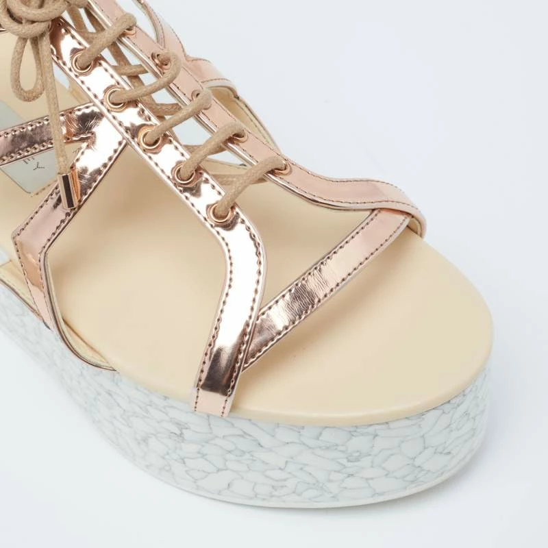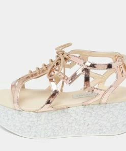 With lace-up vamps and platforms, these Stella McCartney women’s sandals are highly fashionable. Created from faux patent leather in a metallic bronze hue, the pair features rubber soles, open toes, and velcro closure.