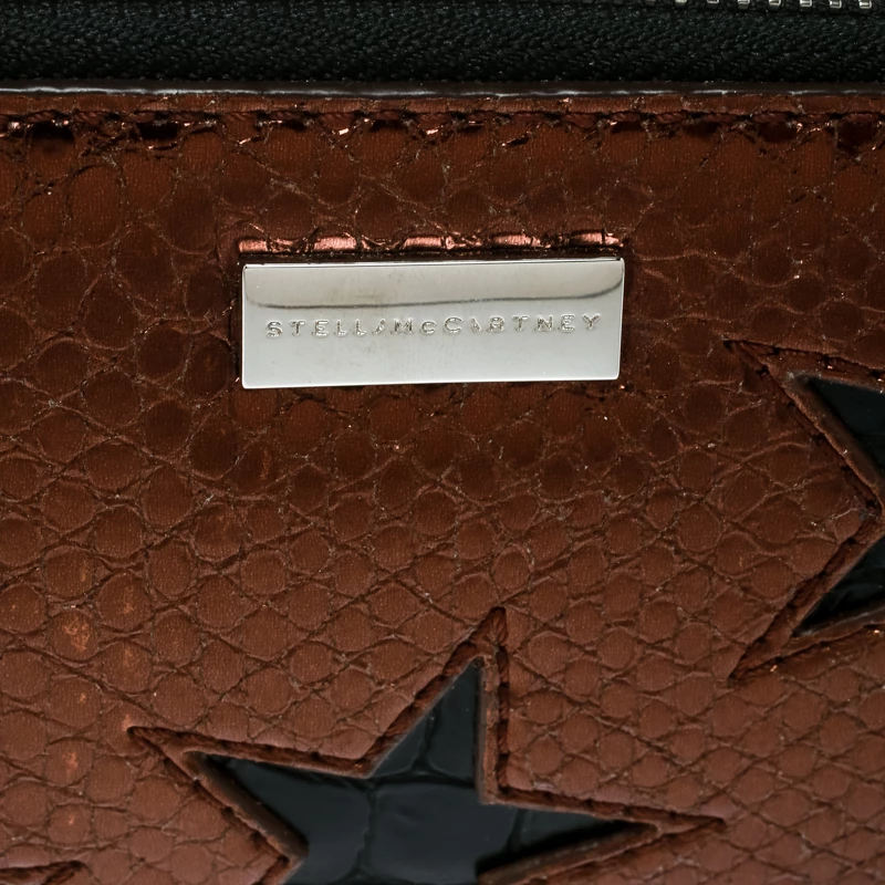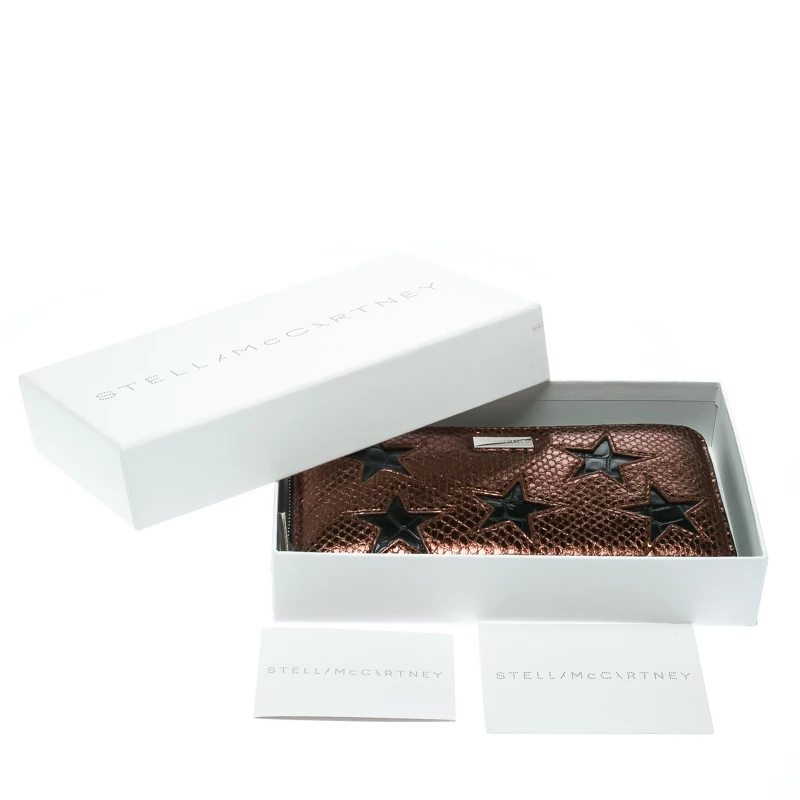 Look stately and sleek with this Stella McCartney wallet. It is crafted from faux leather and designed with beautiful stars on the exterior. This piece comes with a zip closure that opens to a faux leather and fabric interior housing multiple card slots, two open compartments and a zip coin pocket.