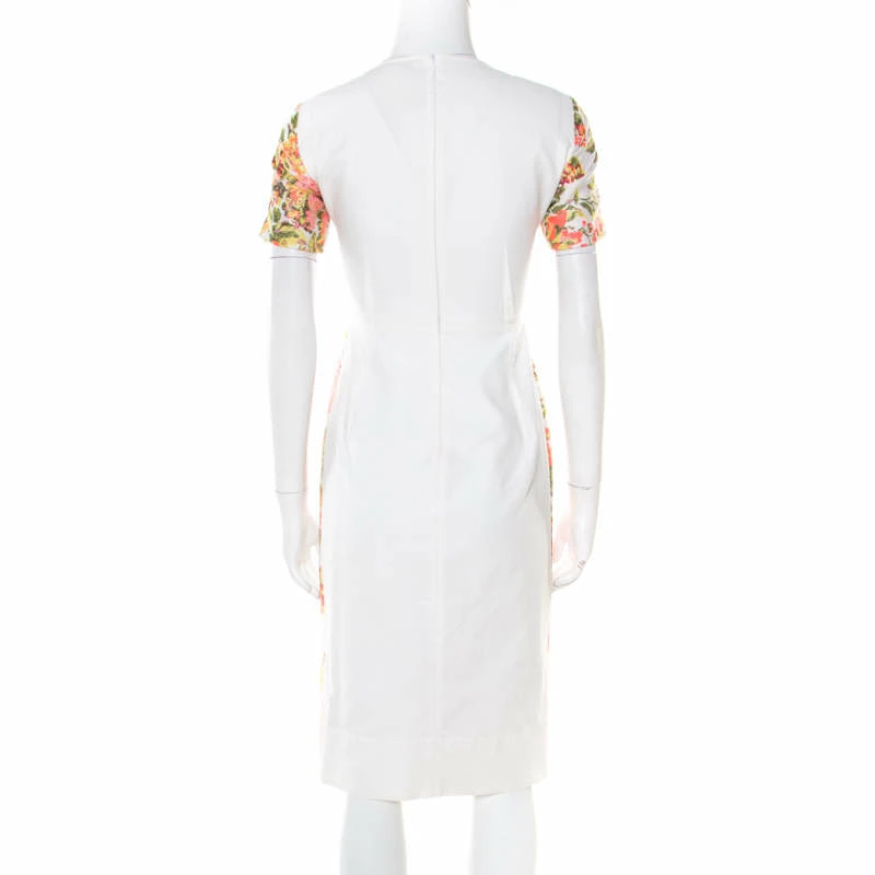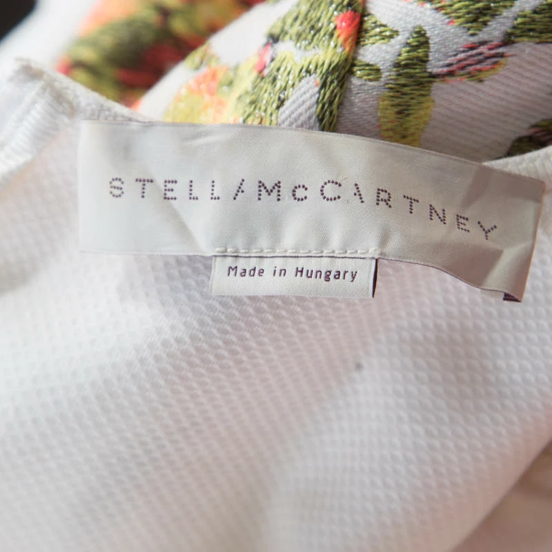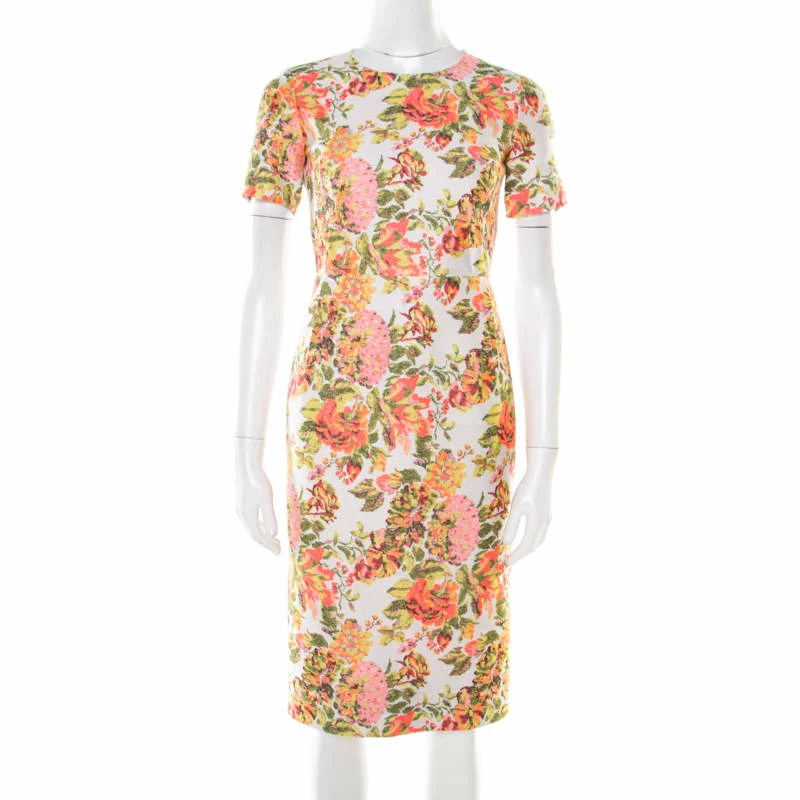 Creations from Stella McCartney are effortlessly stylish just like this fabulous dress! The metallic neon dress is made of a blend of fabrics and features a lovely floral jacquard pattern. It flaunts a crew neck and short sleeves. It comes equipped with a concealed zip closure at the back and will look great with platform sandals and an embellished cocktail ring.
