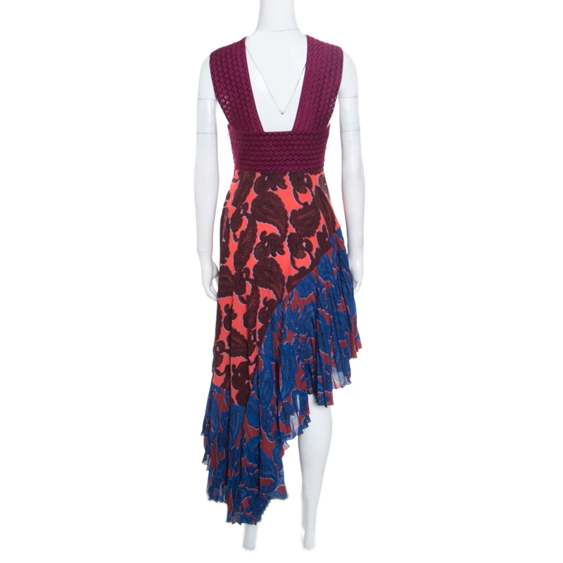 A lovely dress that offers you both glamor and style, this Stella McCartney creation is fabulously crafted with silk into an asymmetrical silhouette. It is fashioned with an asymmetric hemline and features a multicolored print all over, offering the outfit a boho vibe. The dress has a cross front with cutouts at the bodice along with pleats at the skirt area to give the piece a flattering appeal. Wear this with low heels to complete your look.