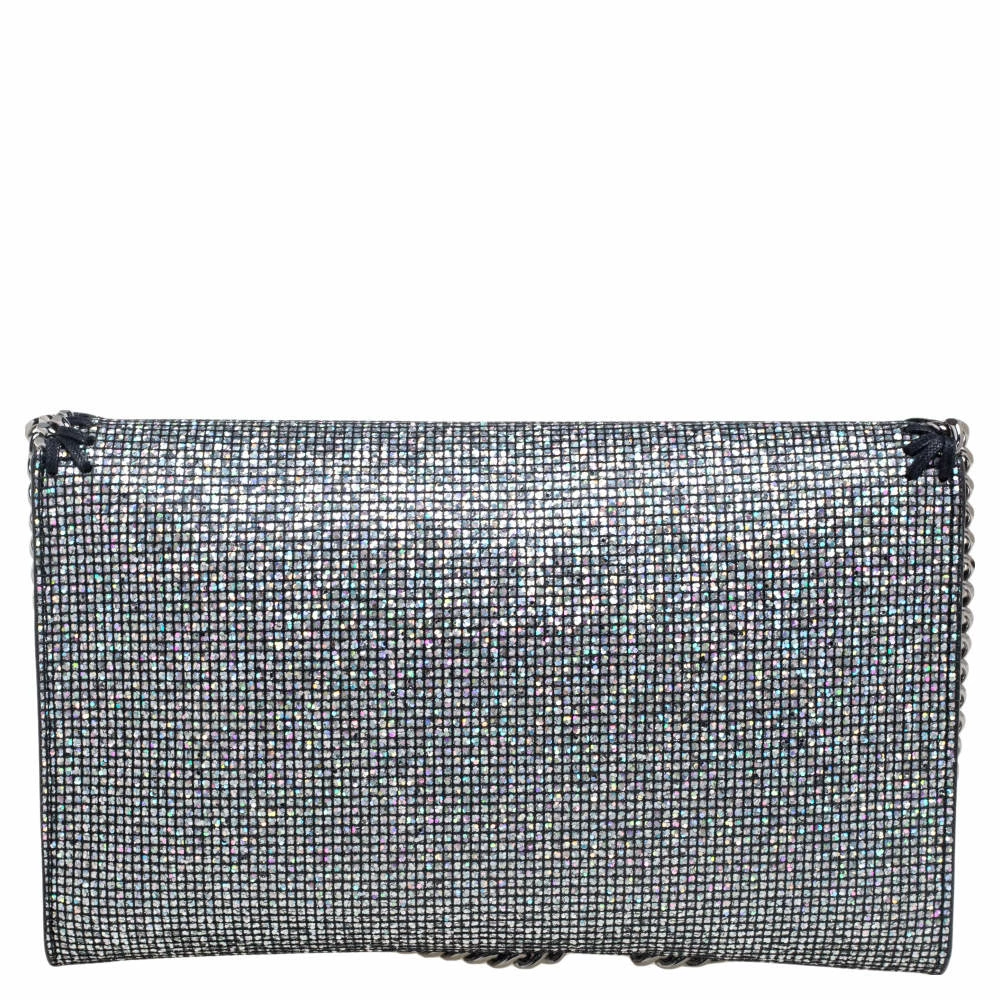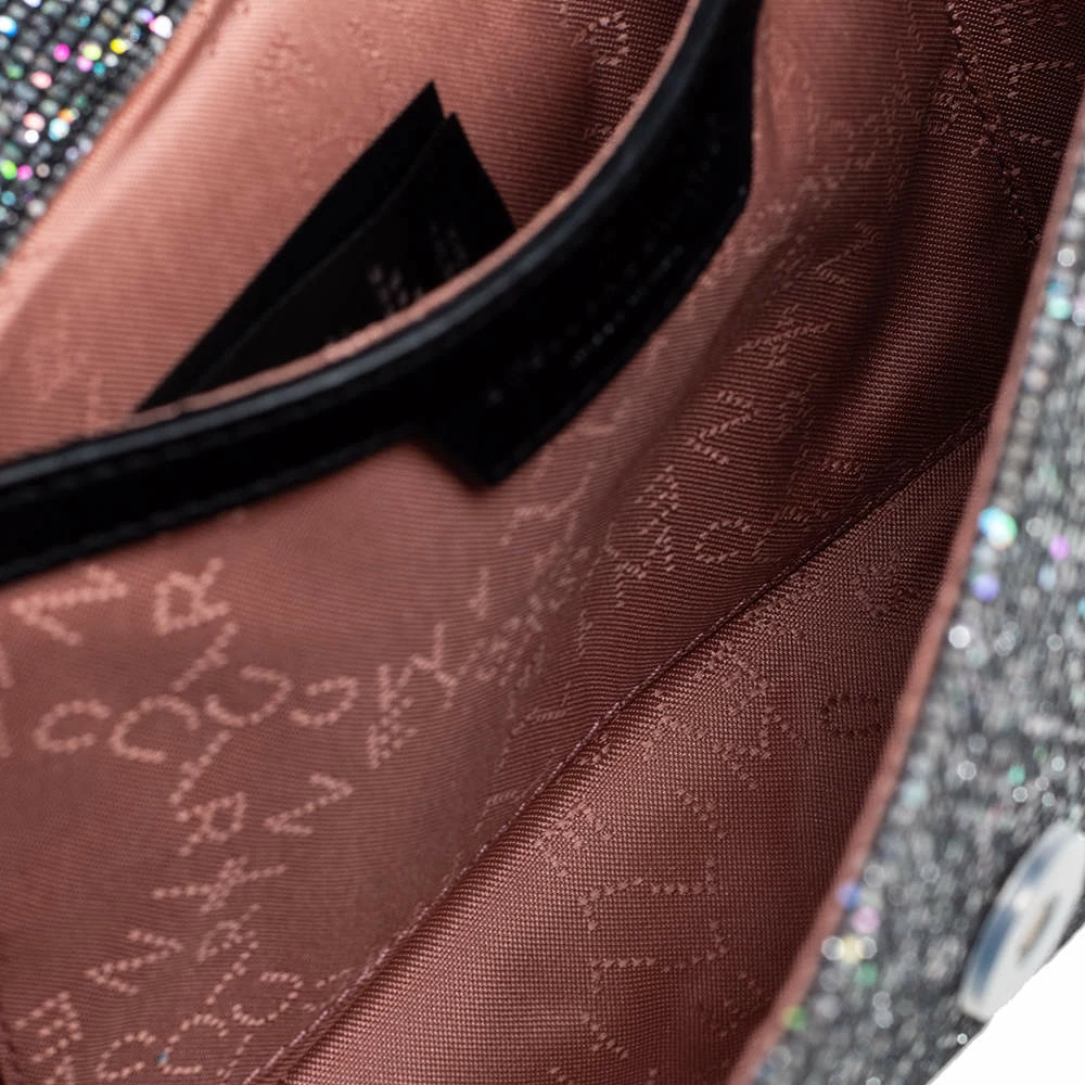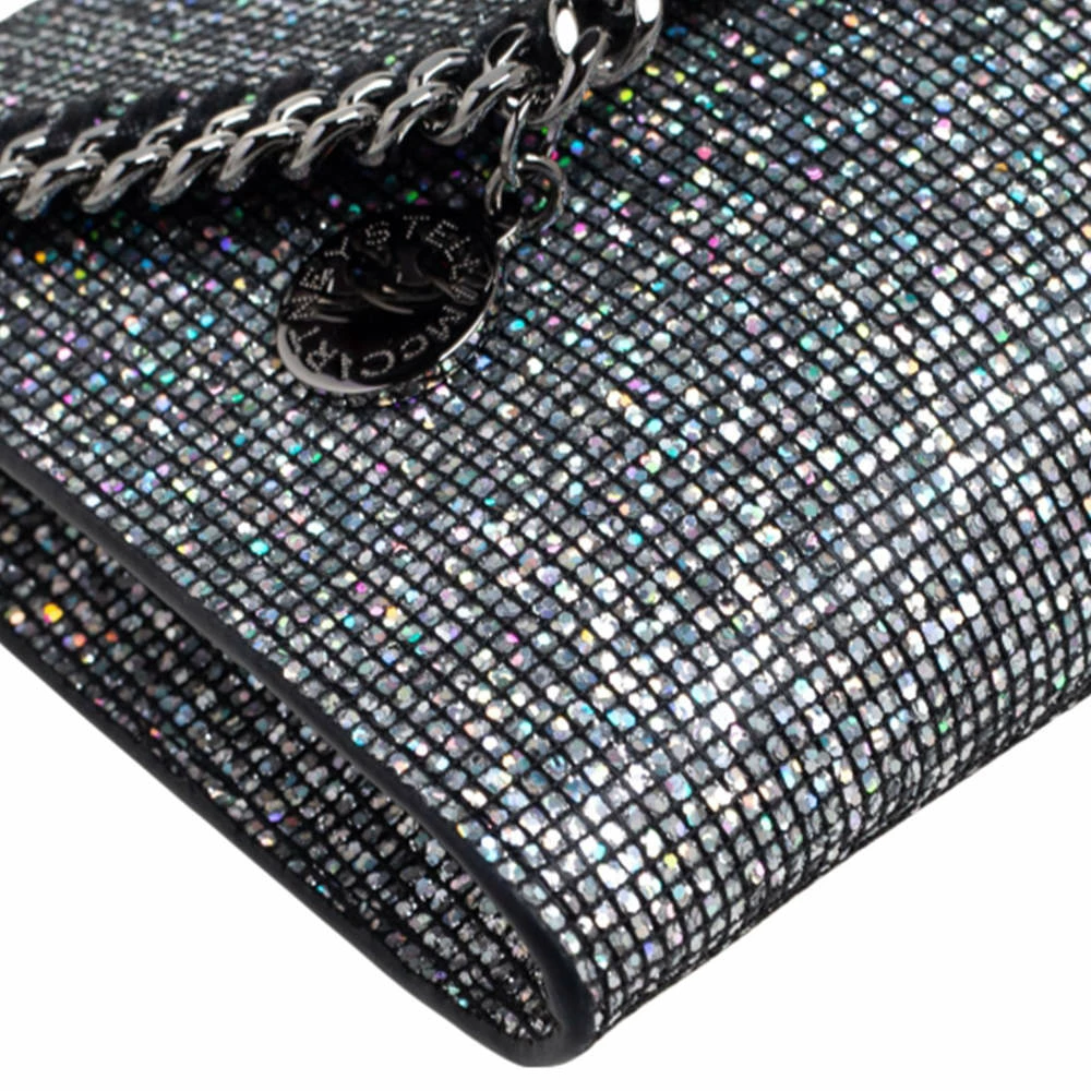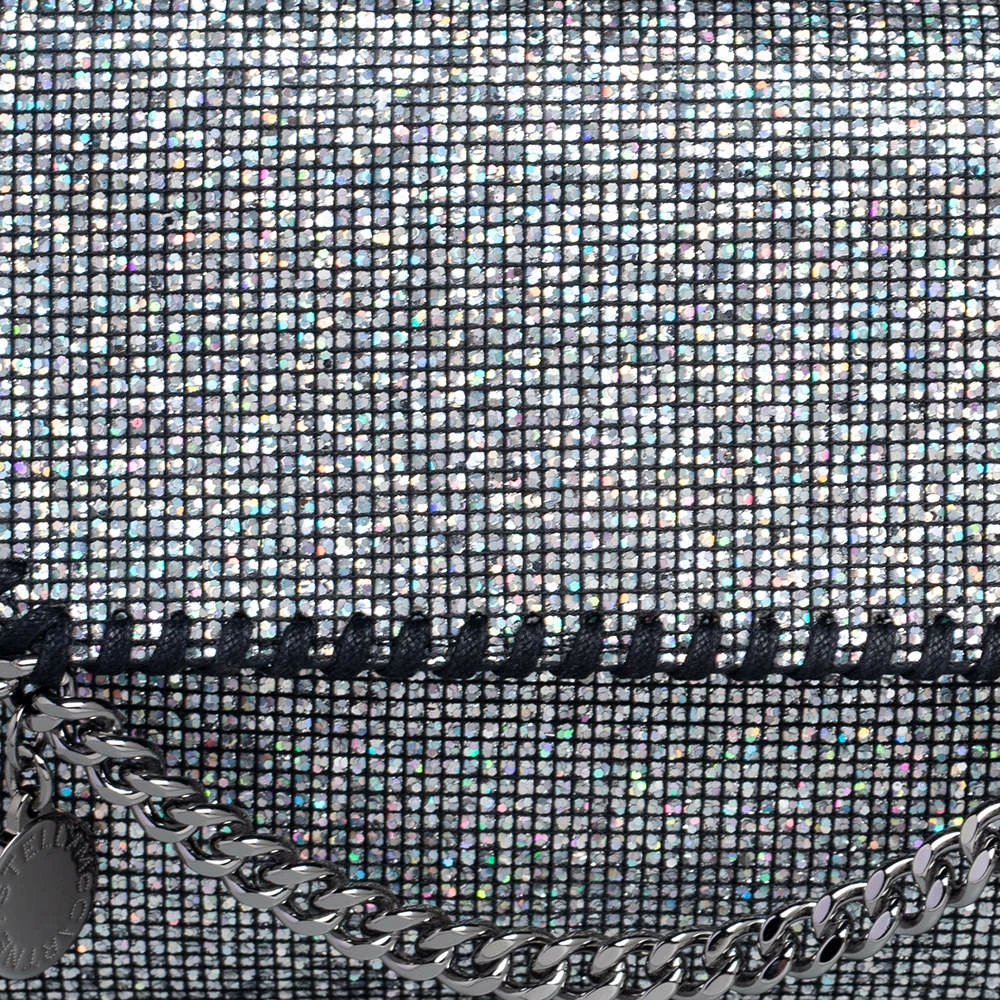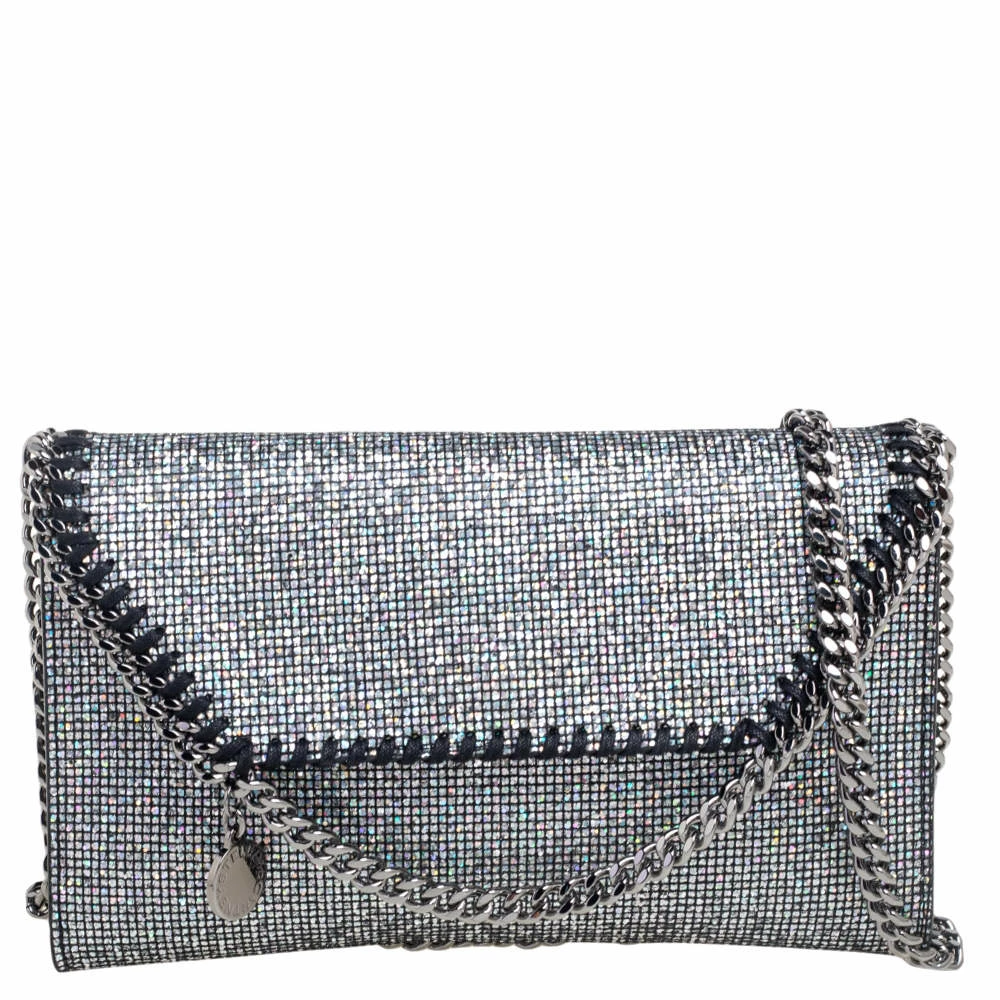 This Falabella crossbody bag from Stella McCartney is finely crafted from metallic disco glitter and styled with a front flap that has silver-tone metal chain stitch detailing. Its nylon interior offers enough space to hold your daily essentials and it is held by a chain-link shoulder sling.