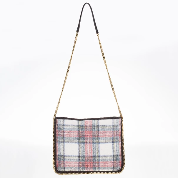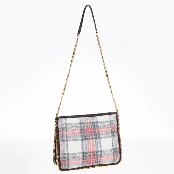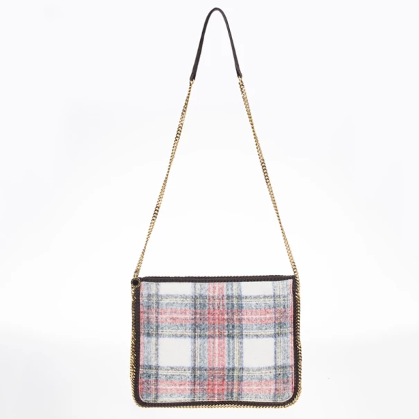 Designed with the Scottish check, this Stella McCartney bag is the perfect addition to a winter outfit. Its tartan wool exterior creates a cozy look, while its brown leather trim defines its shape. It is surrounded with a braided chain, continuing to form the shoulder strap. The interior, lined with textile, has a zip closure and is outlined with brown suede. It has two compartments and one open pocket.