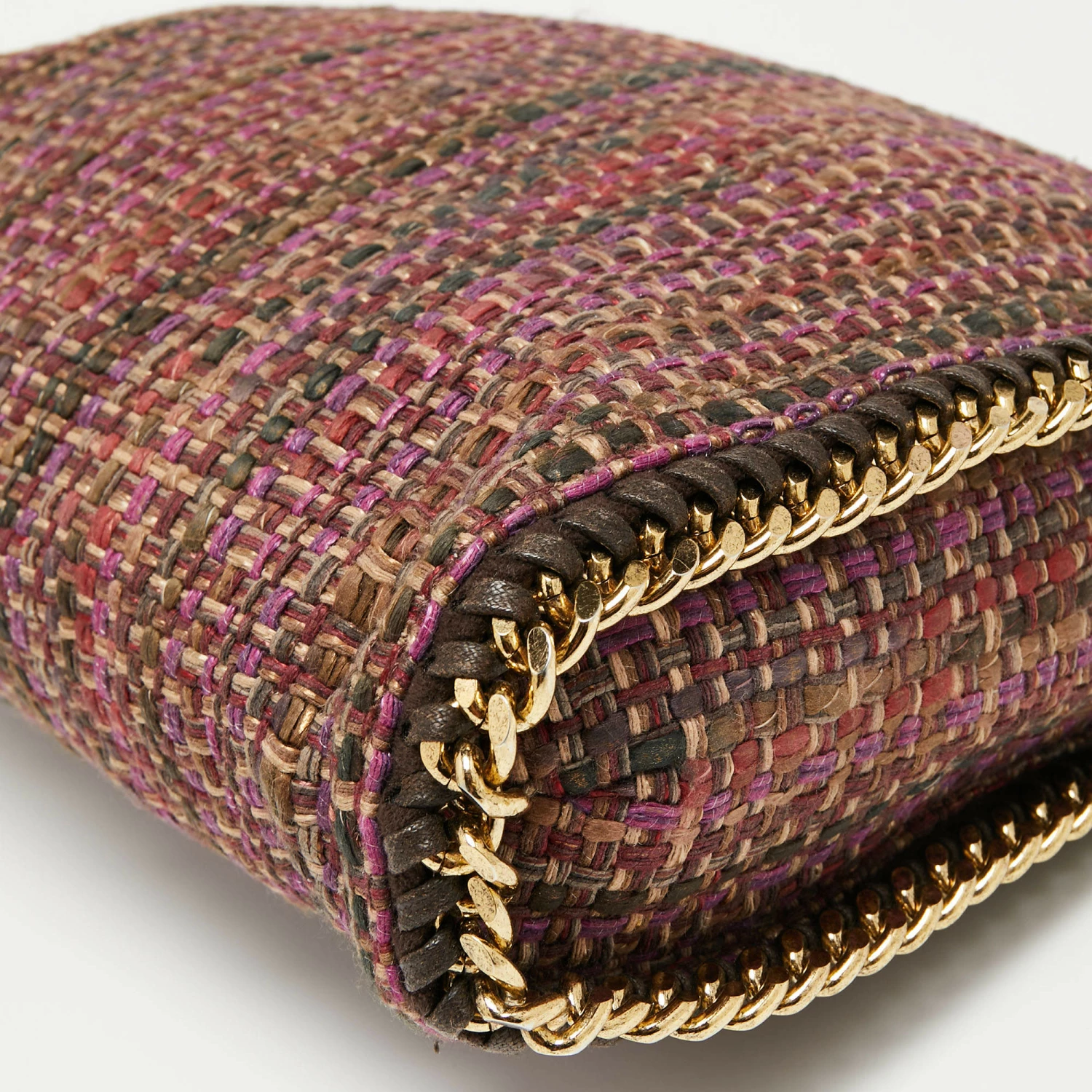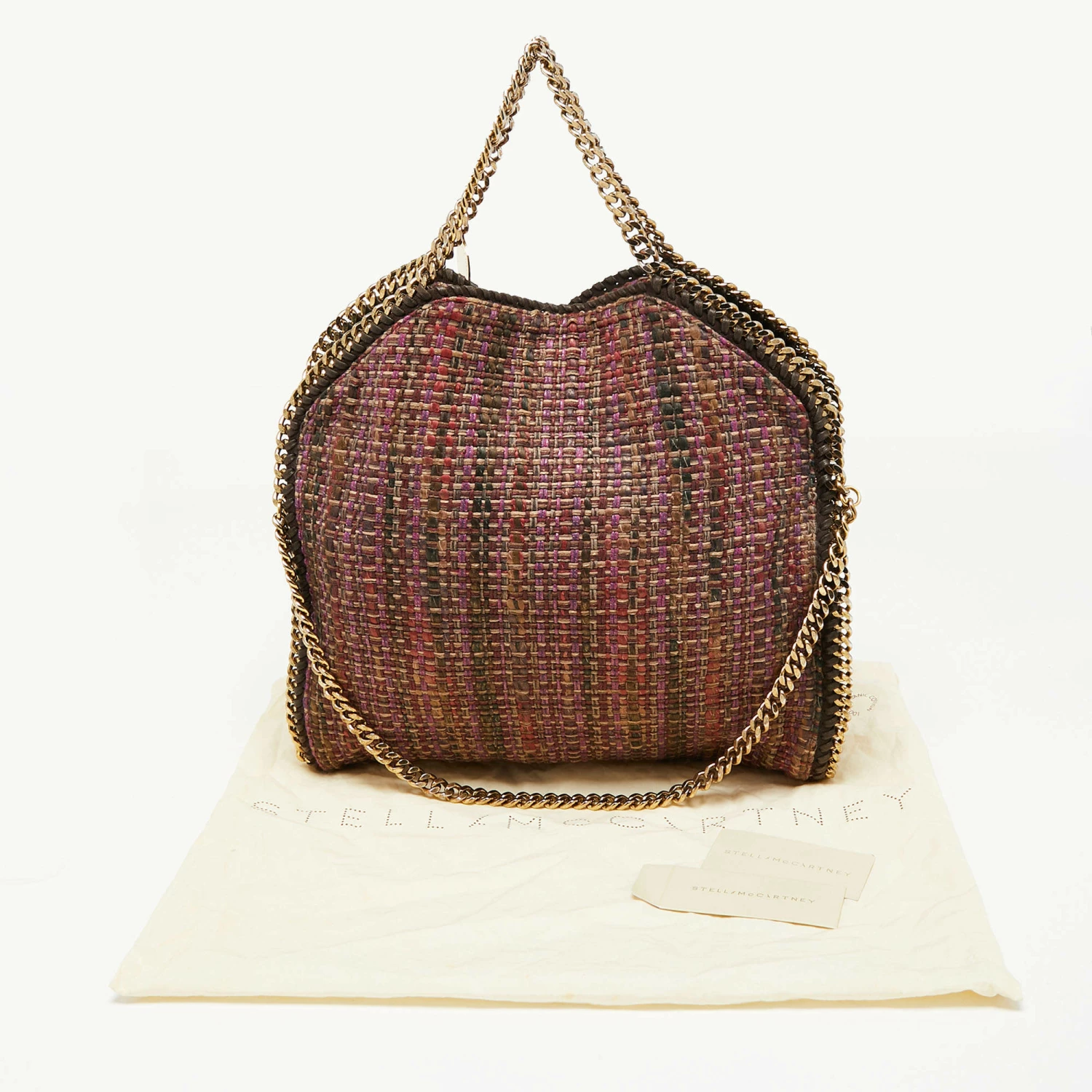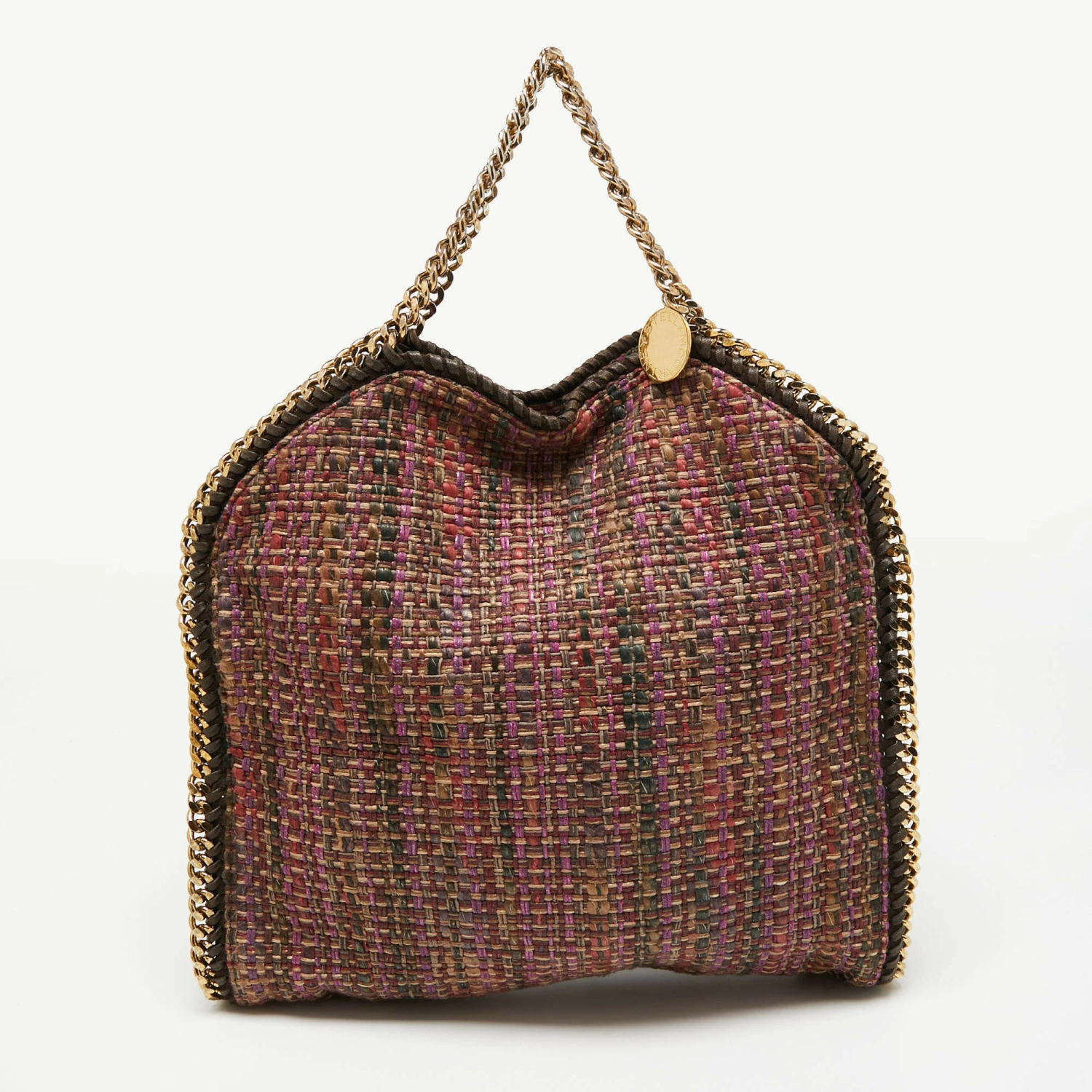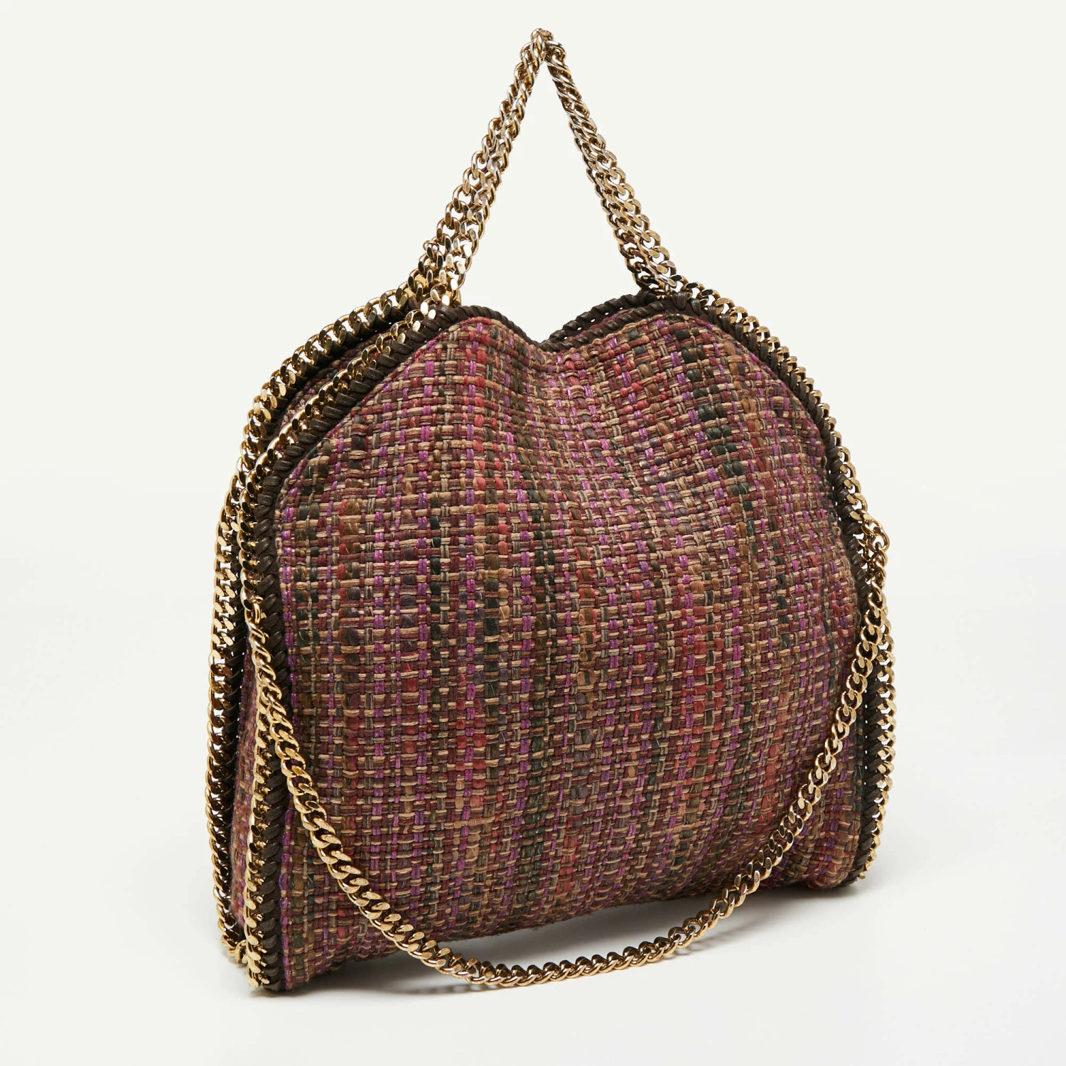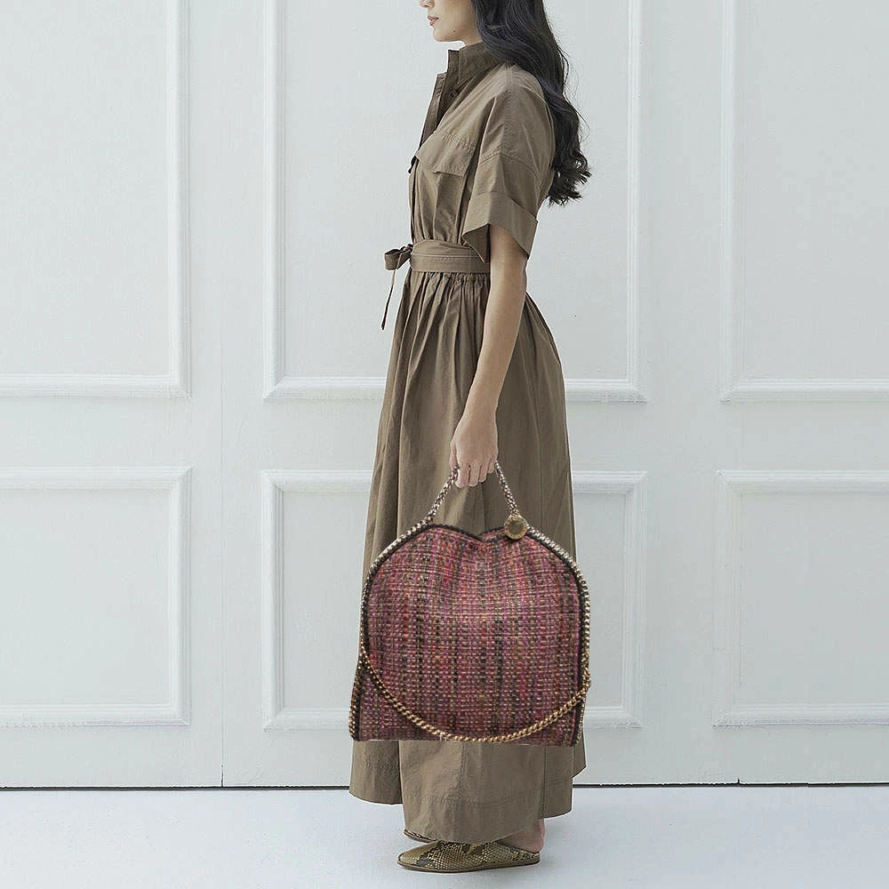 This Falabella tote from Stella McCartney is one of the most loved designs from the sustainably conscious label. Crafted from woven tweed, it is durable and stylish. While the chain detailing elevate its beauty, the fabric-lined interior will dutifully hold all your daily essentials. You can swing this tote using the chain handles.