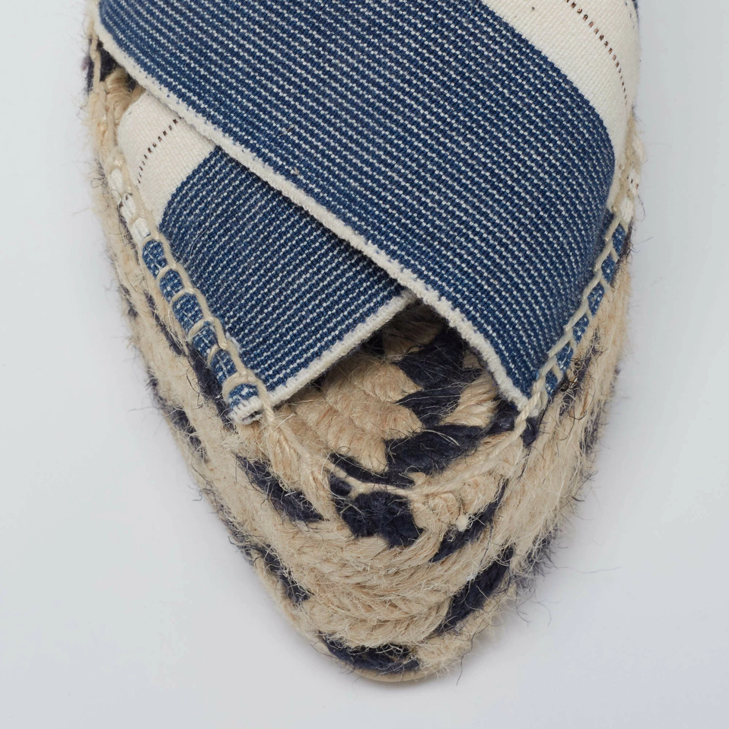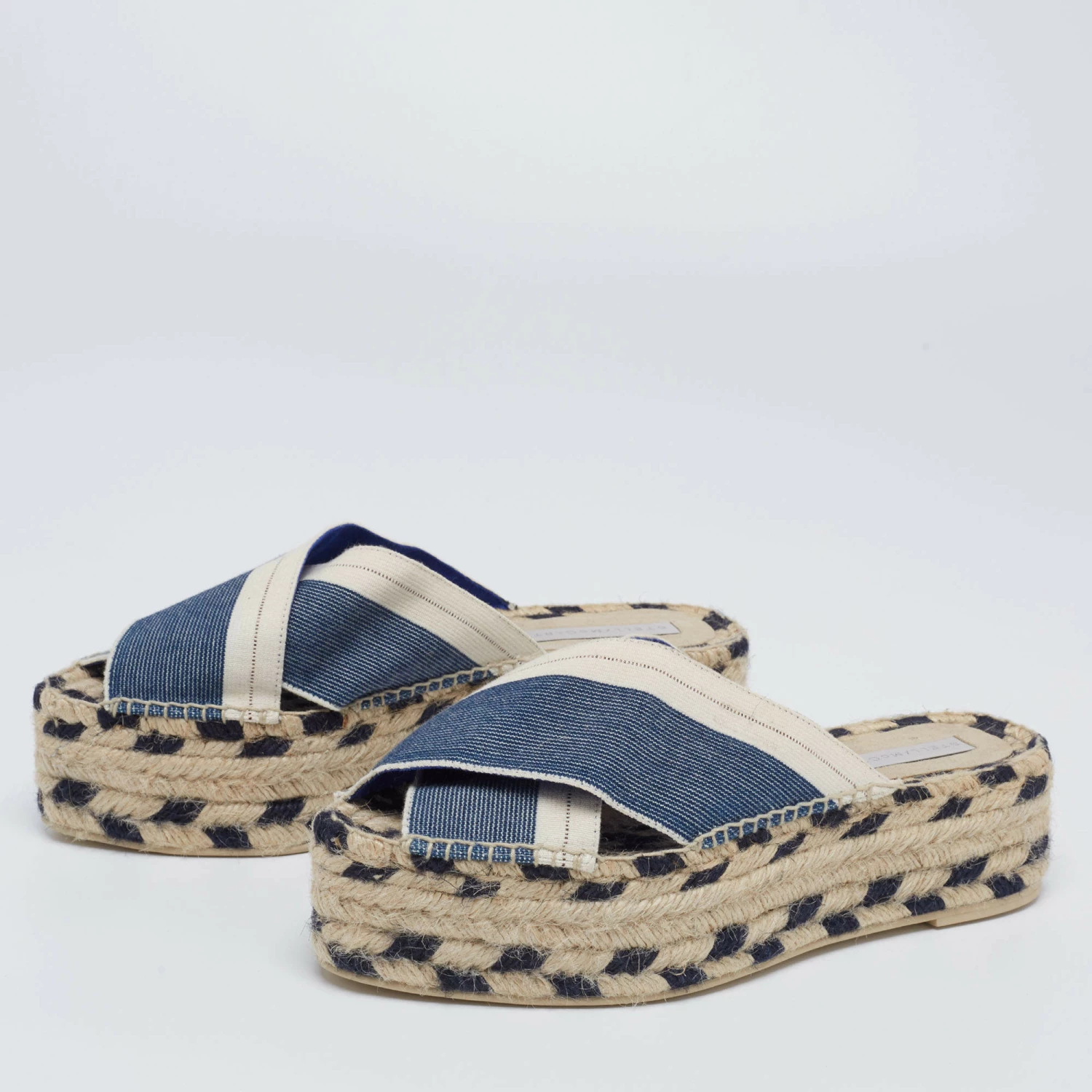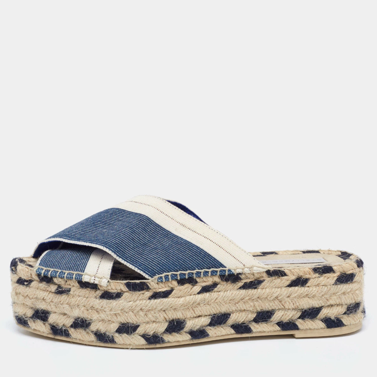 These sandals by Stella McCartney are utterly mesmerizing and filled with so much beauty, they make our hearts flutter. They carry a navy blue-beige canvas exterior, peep-toes, and espadrille platforms that will surely make heads turn. They’ll look fabulous with sundresses!