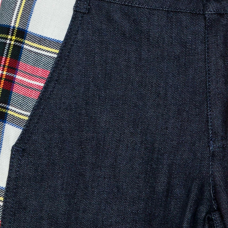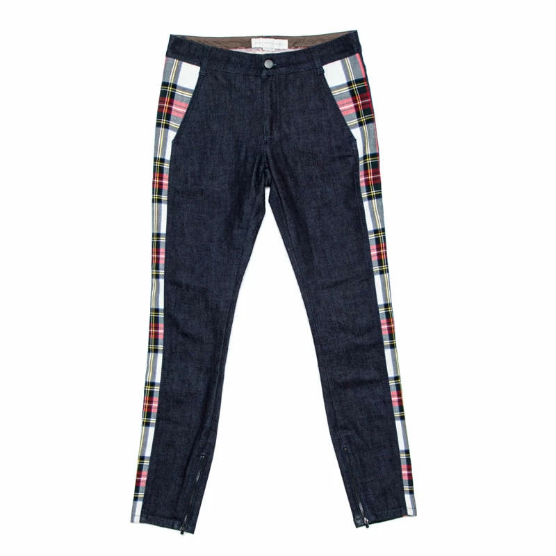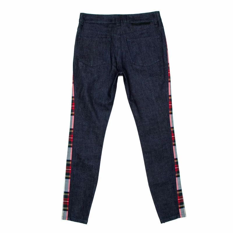 Grab these jeans from Stella McCartney now. Crafted from a cotton-blend, these navy blue denim jeans are great for casual outings. They are styled with four pockets, plaid trims, zip closure, belt loops and have a good fit. Pair with a simple t-shirt.