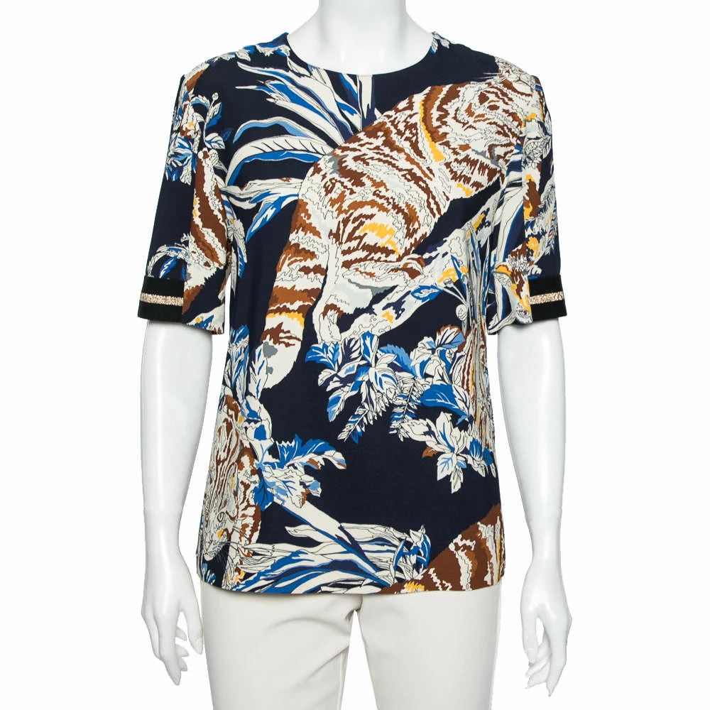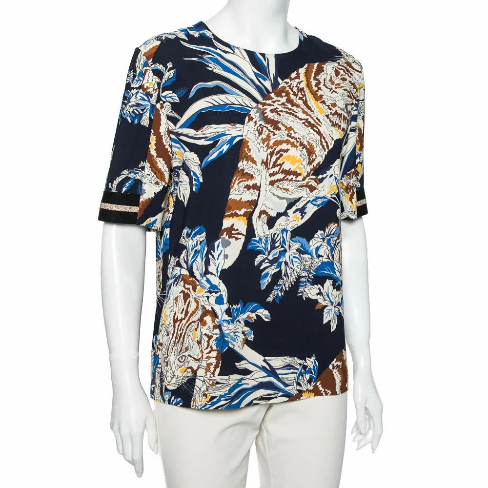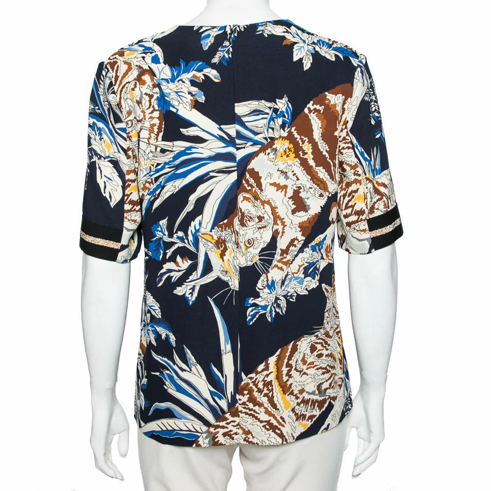 Add a pop of color to your casual ensemble by wearing this blouse from the House of Stella McCartney. Fashioned using quality fabrics, this blouse displays a chic style like none other. It is designed with cat prints all over. Complement this blouse with white pants and look gorgeous.