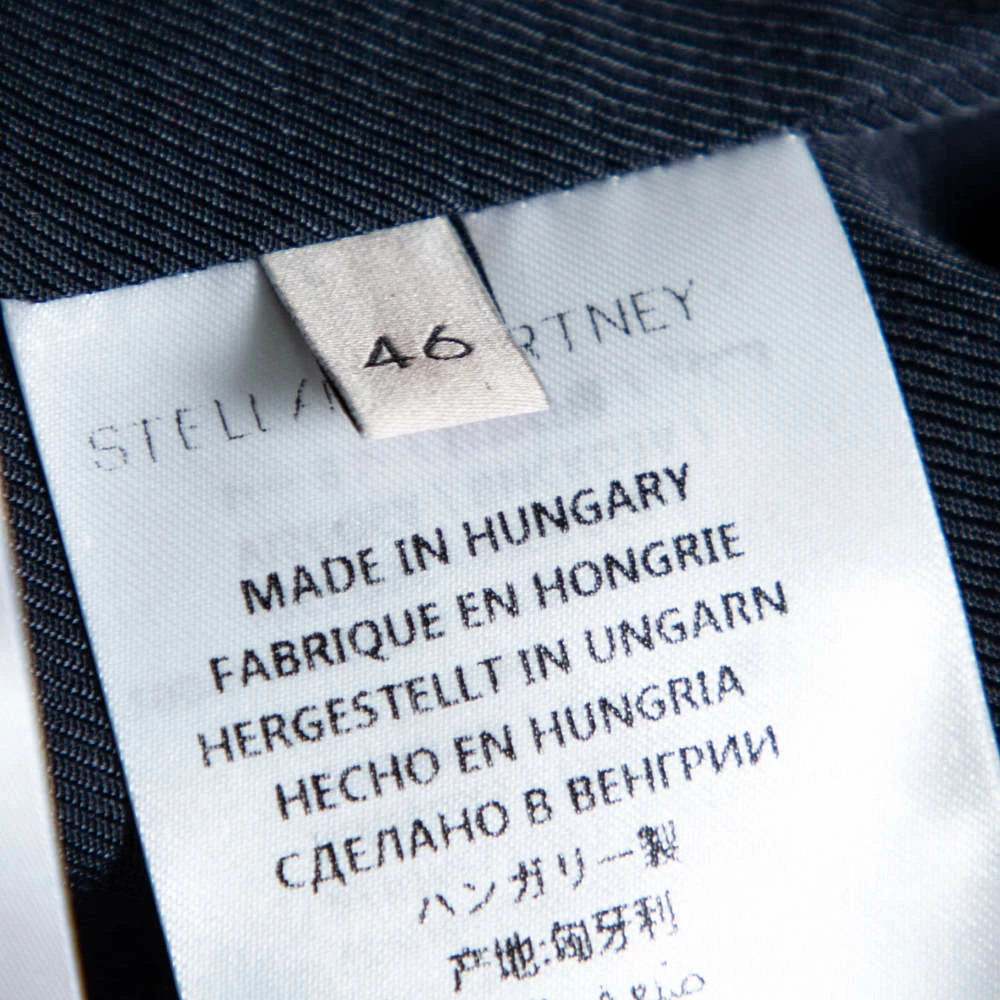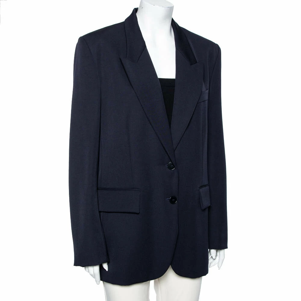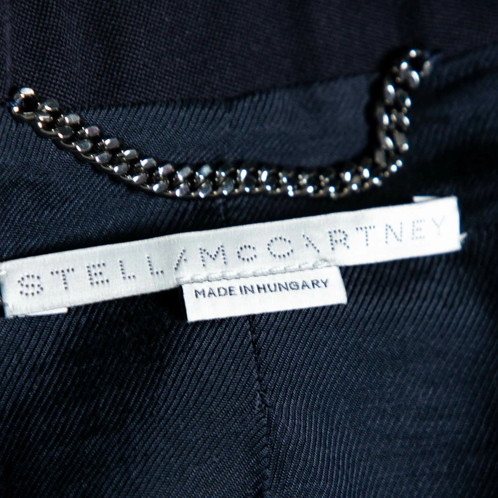 Make a powerful style statement in this Stella McCartney blazer that is crafted from wool. It features a navy blue hue, pockets, and front buttons. Pair the single-breasted blazer with matching trousers and a simple top.