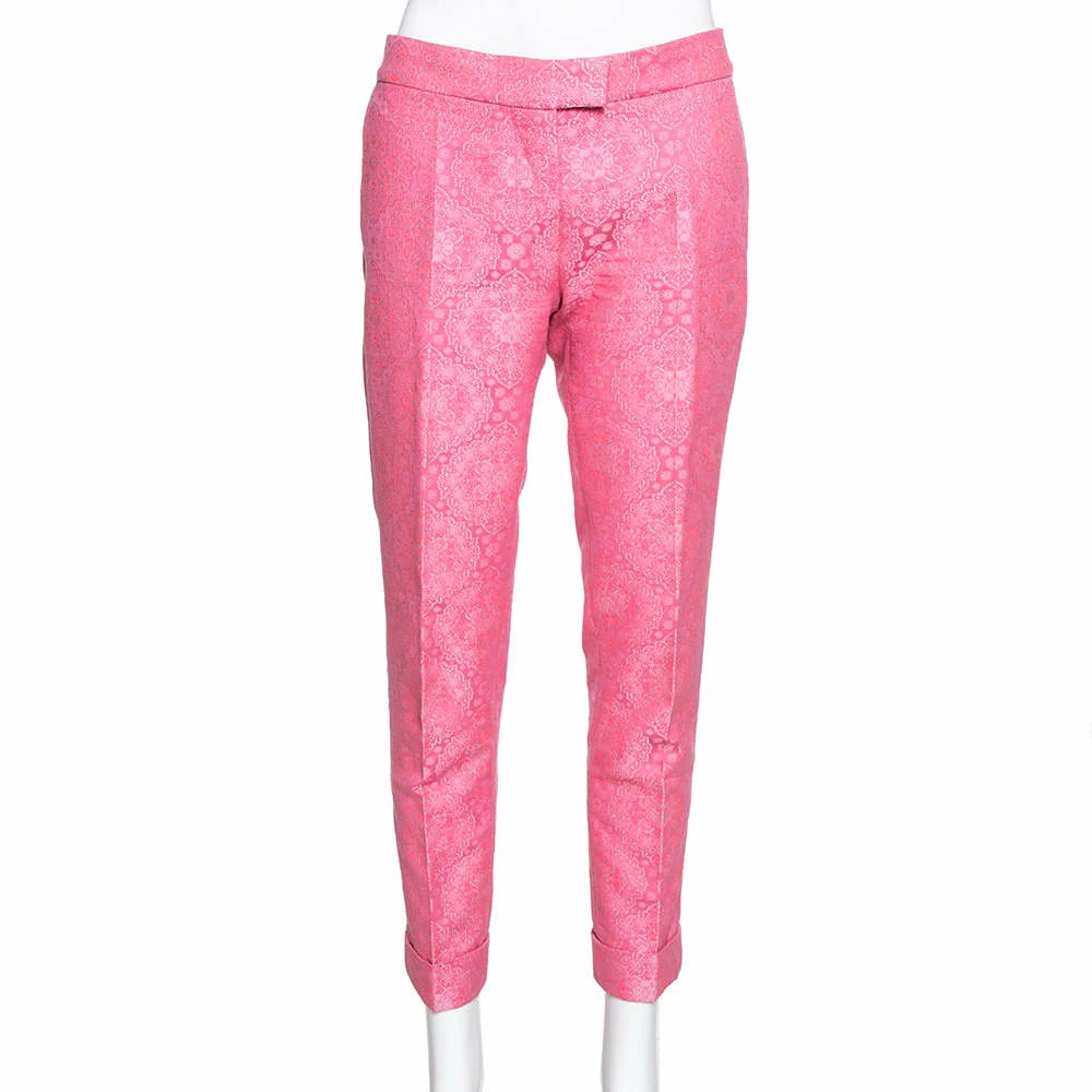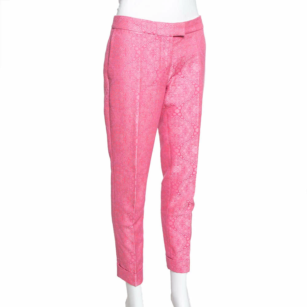 Gorgeously designed, these neon pink pants from Stella McCartney will lend a chic vibe to your closet. They offer a tapered fit and exhibit a jacquard pattern all over. They are equipped with a zip closure at the front and a slip pocket at the back. They’ll look best with a simple top and pointed pumps!