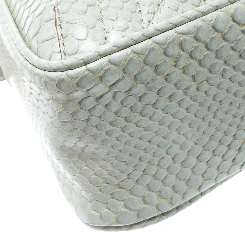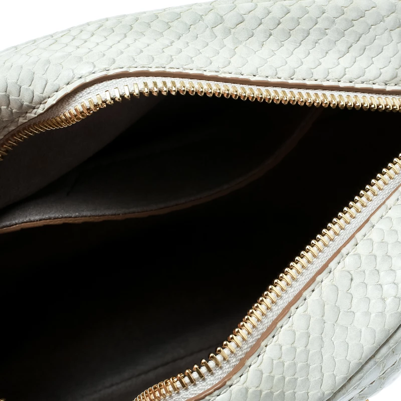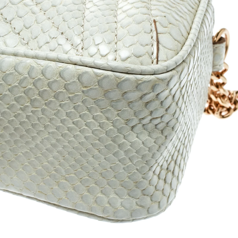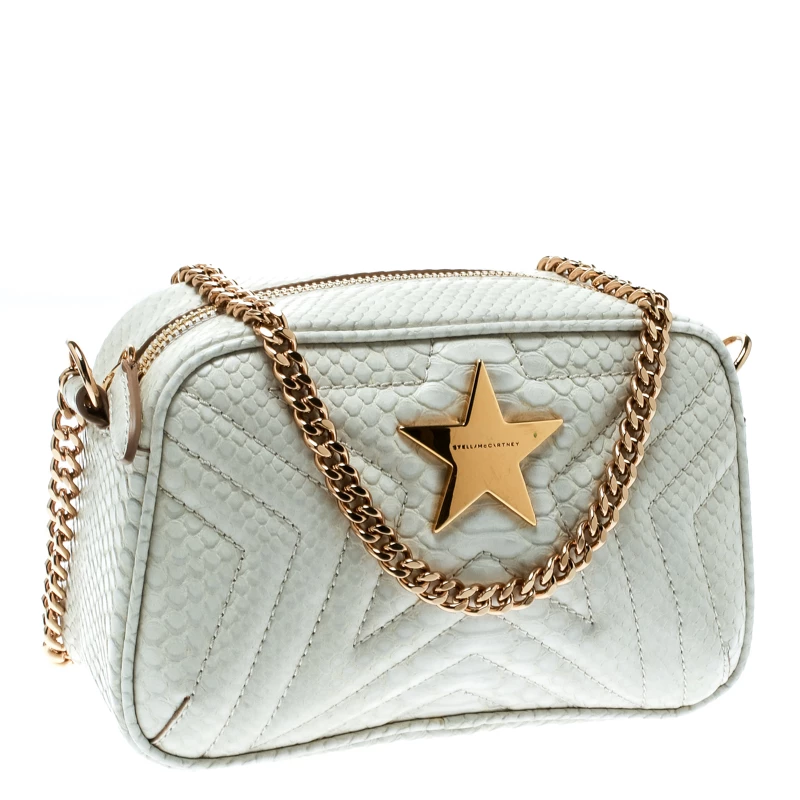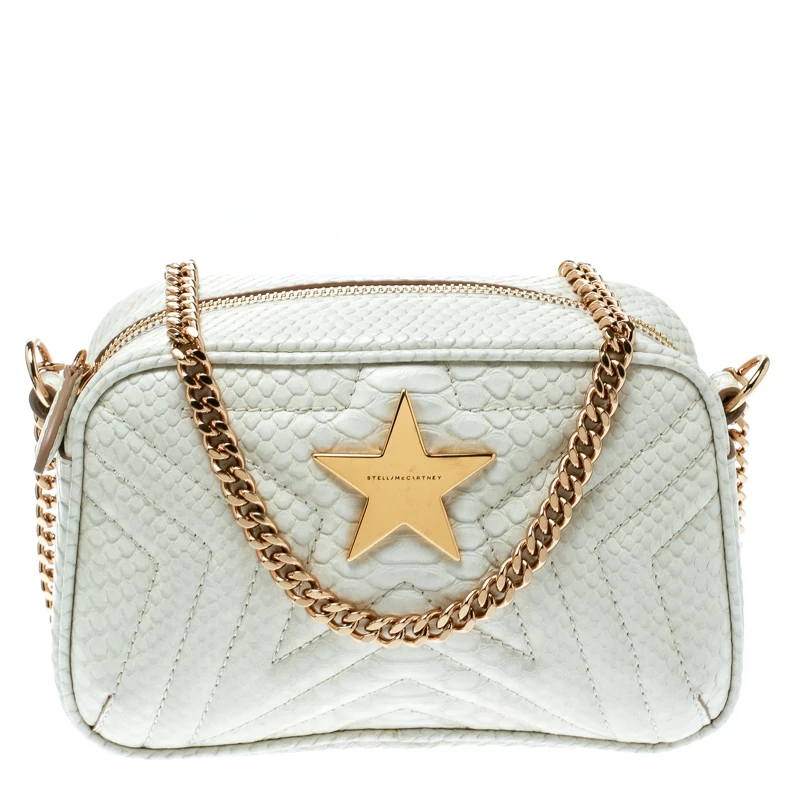 Carefully designed to evoke a grand and stately look, this faux python bag is sure to make heads turn. Its exterior is accented quilted patterns and a gold-tone star motif at the front face. The faux suede lining ensures an immaculate finish. Fall in love with this absolutely dashing bag from Stella McCartney. Add a trendy touch to your look with this white bag.