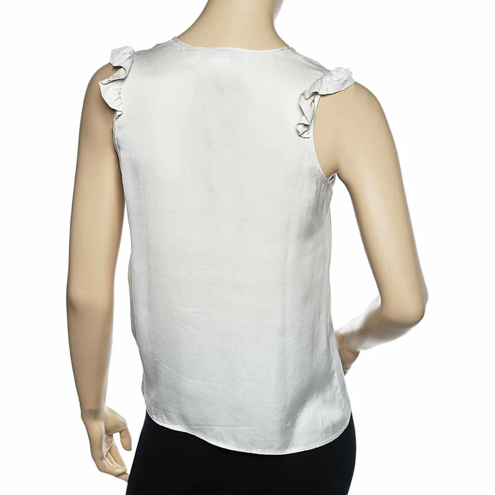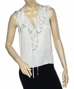 This top from Stella McCartney will outline your style with never-ending femininity and chic aesthetic. It is tailored using off-white silk satin and flaunts a ruffled detailing, a V-shaped neckline, and a sleeveless style. Match this top with black pants to achieve an elegant look.