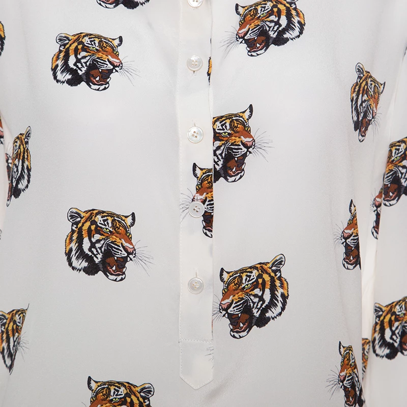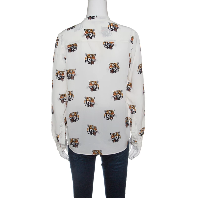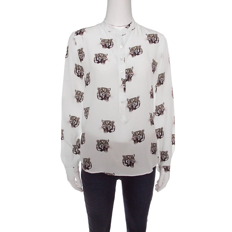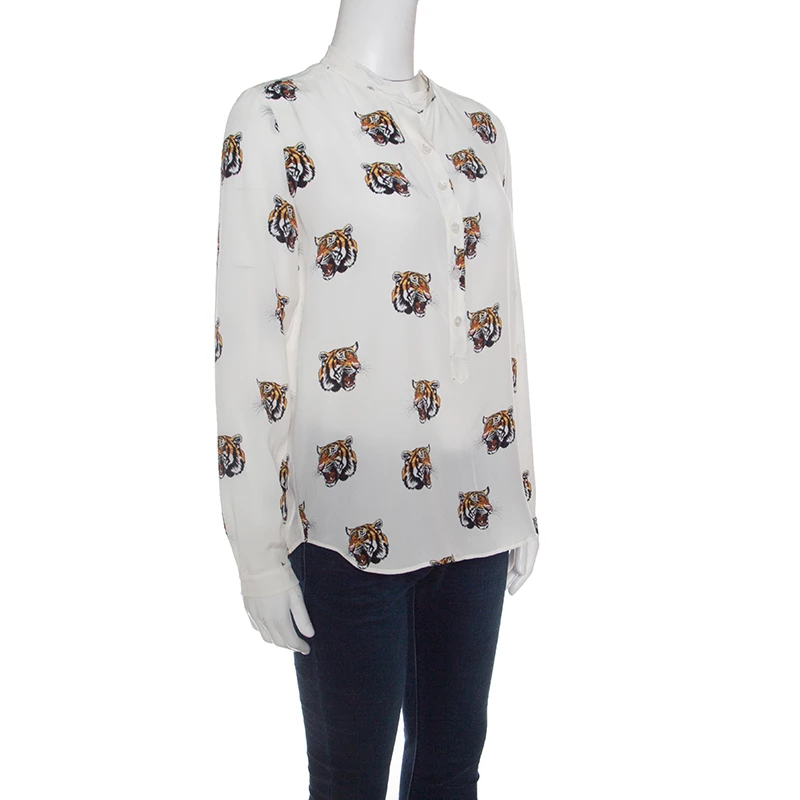 Amazingly stylish and quirky is this off white blouse from Stella McCartney. The blouse is made of 100% silk and features multiple tiger faces printed all over it. It flaunts mandarin collars, front button fastenings and long sleeves. Pair this creation with dark denims and ballet flats for a fun outing with friends.