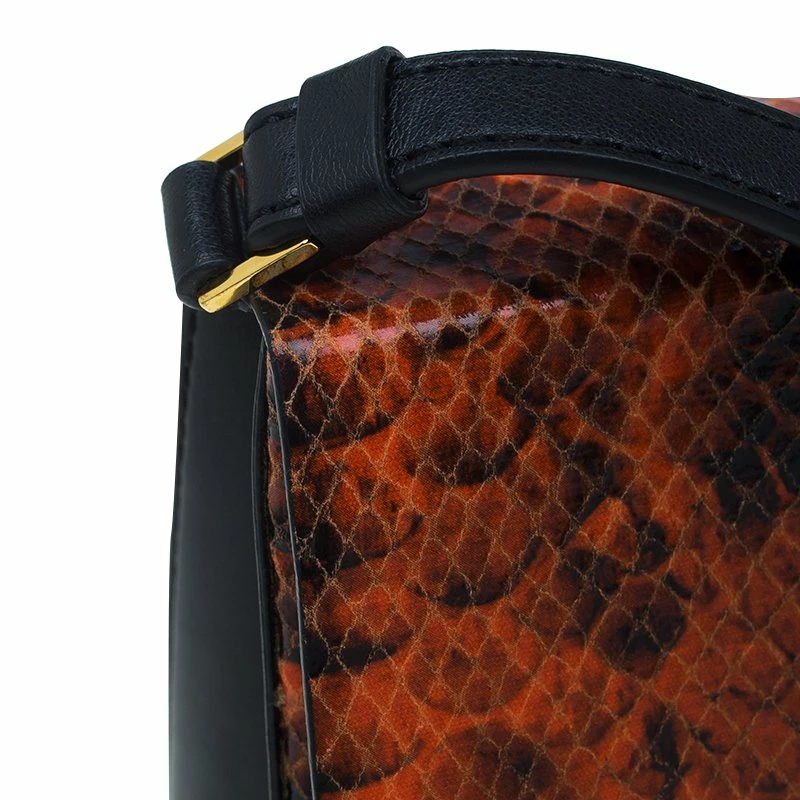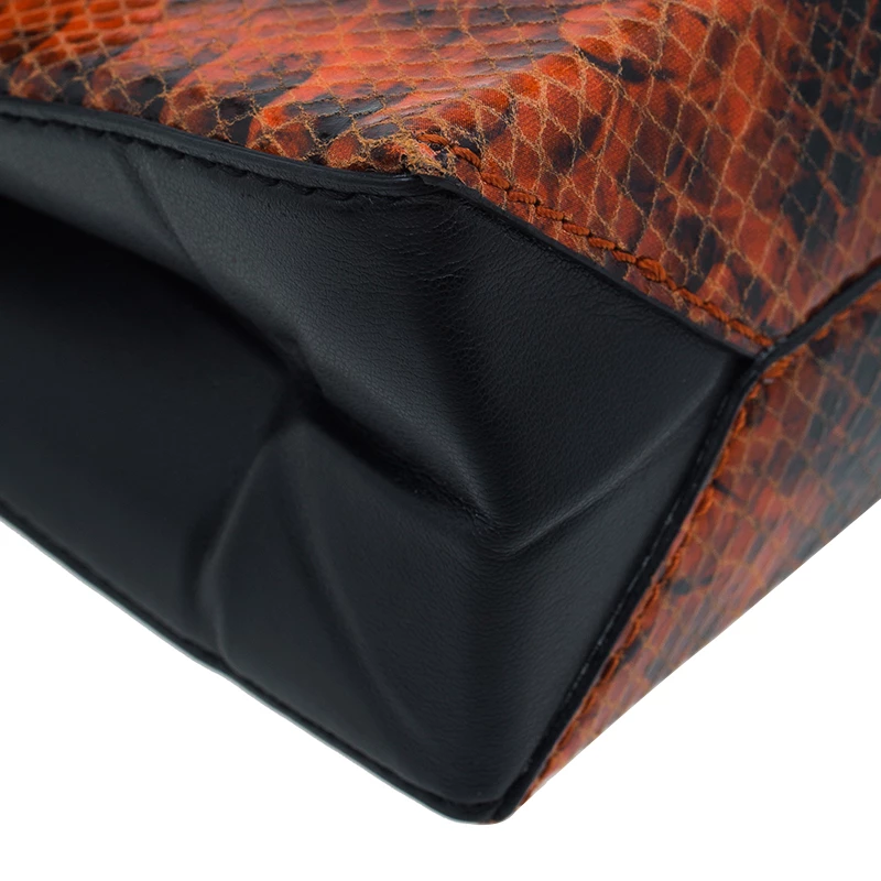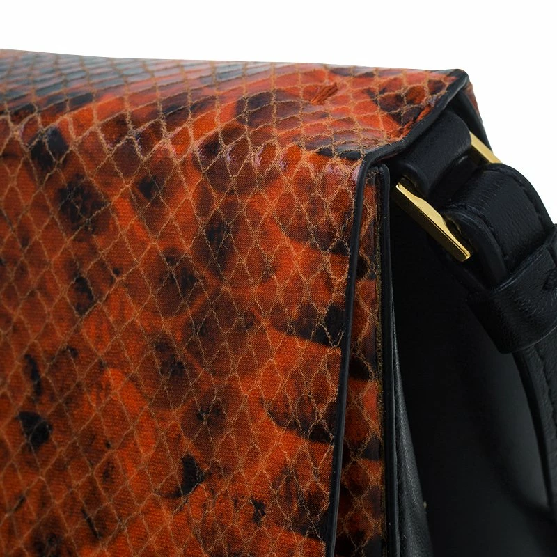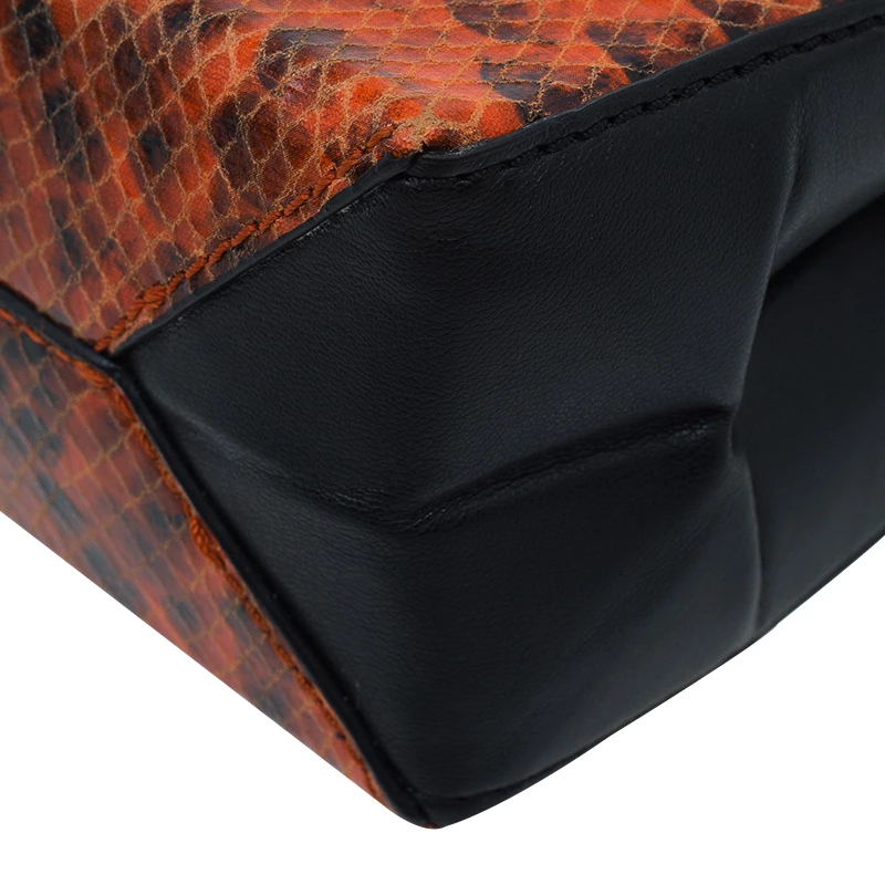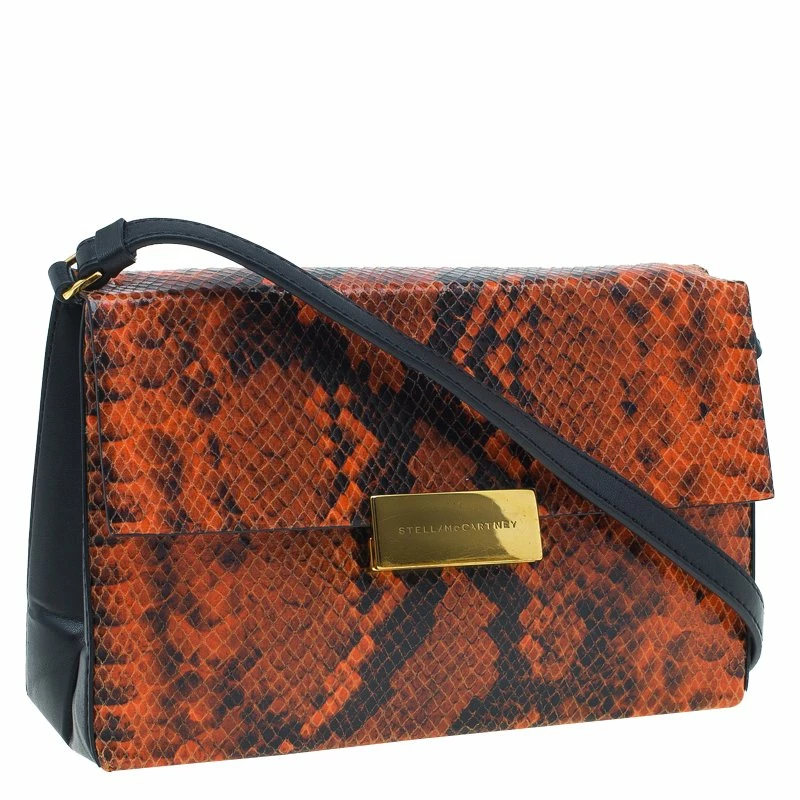 Stella McCartney has yet again put forth her Eco-friendly stance in styling this Beckett cross-body bag. Crafted from faux python leather in orange and black, this mini cross-body bag features a shoulder strap, and brand inscribed gold-tone plate clasp on the flap. It opens into faux suede lined interior.