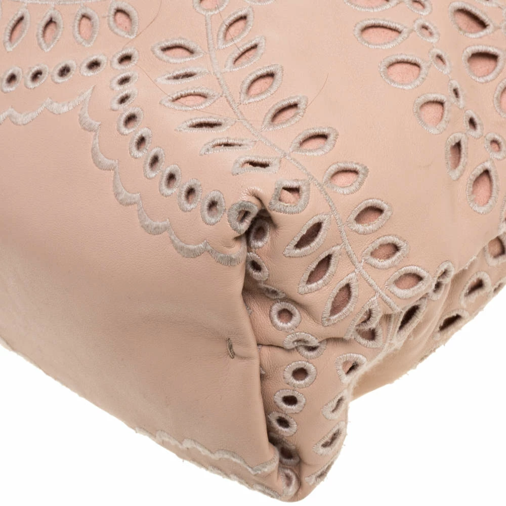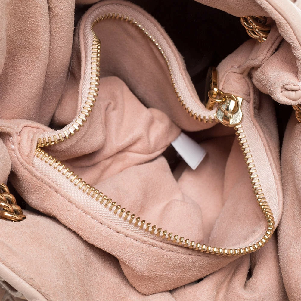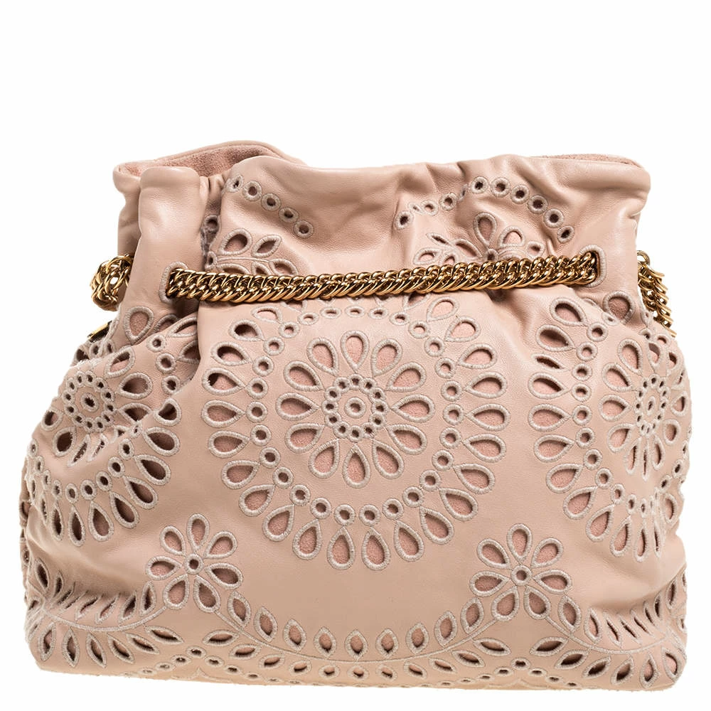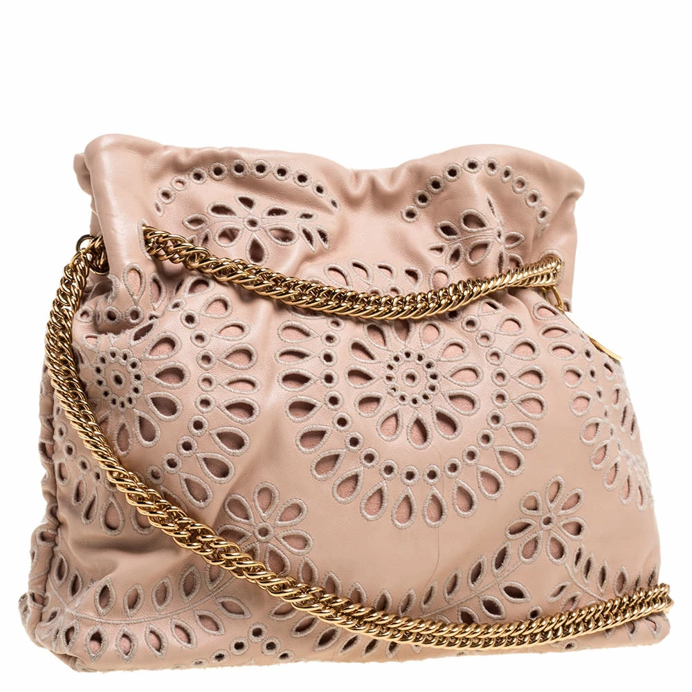 Style your day outfits with this stunning shoulder bag by Stella McCartney. Crafetd from faux leather, it comes in a lovely shade of peach. The exterior has laser-cut floral detailing, a chain closure that extends to become a shoulder strap. It has a suede-lined interior and is finsiehd with gold-tone hardware.
