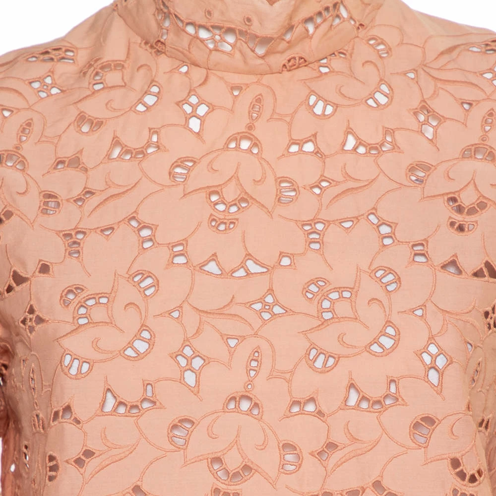 This Stella McCartney top is an impeccable example of new-fashioned designs combined with subtle style. Skillfully tailored, this gorgeous top is crafted from eyelet lace in the shade of pink. Channel a chic, feminine vibe by styling it with a solid-colored skirt and strappy sandals.