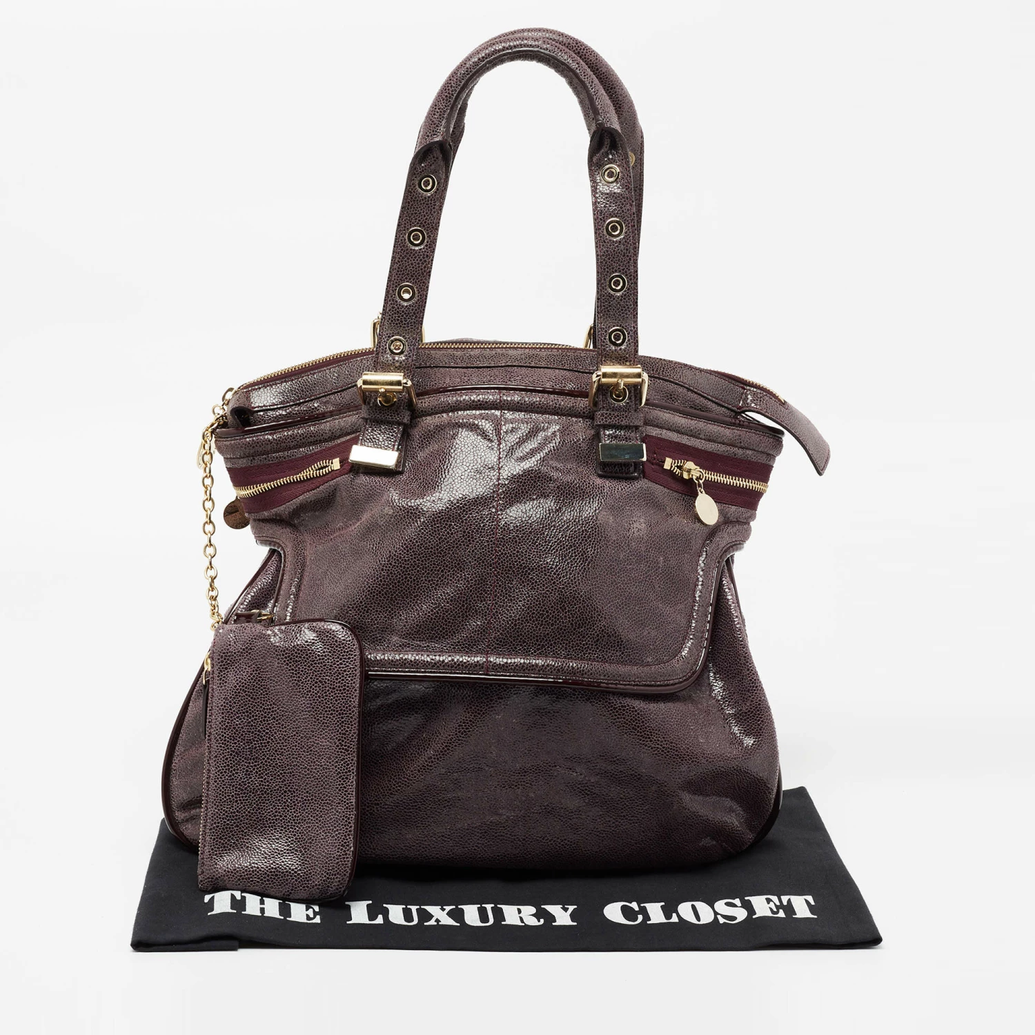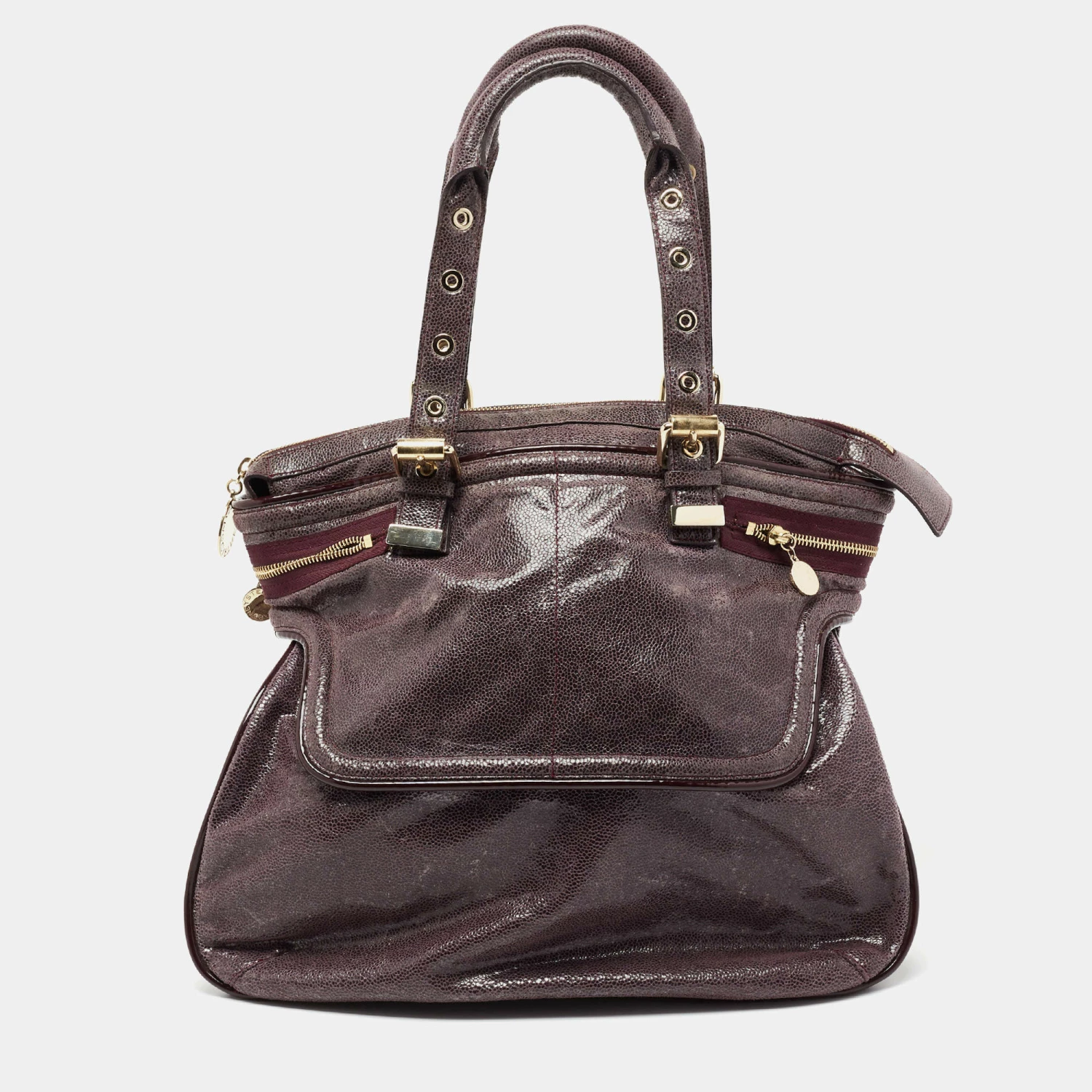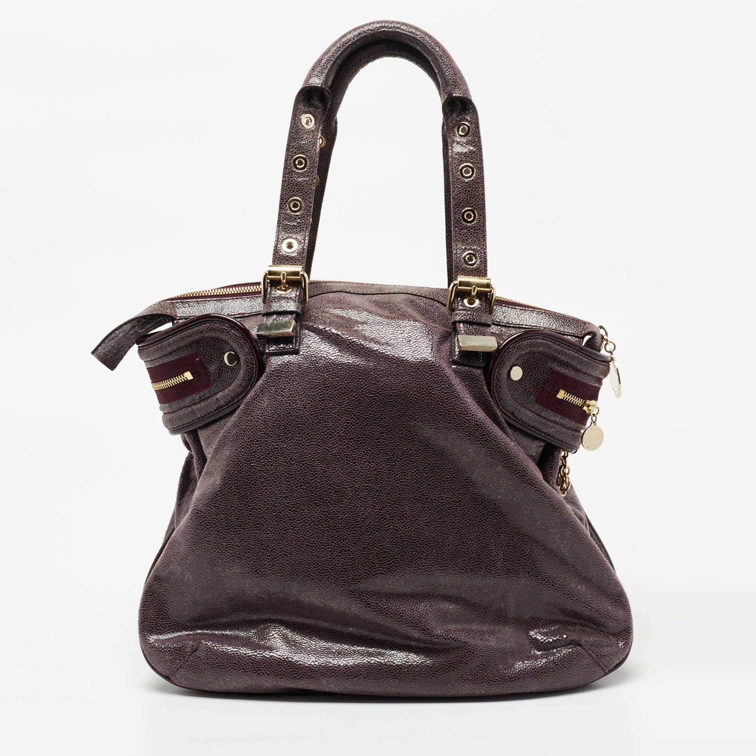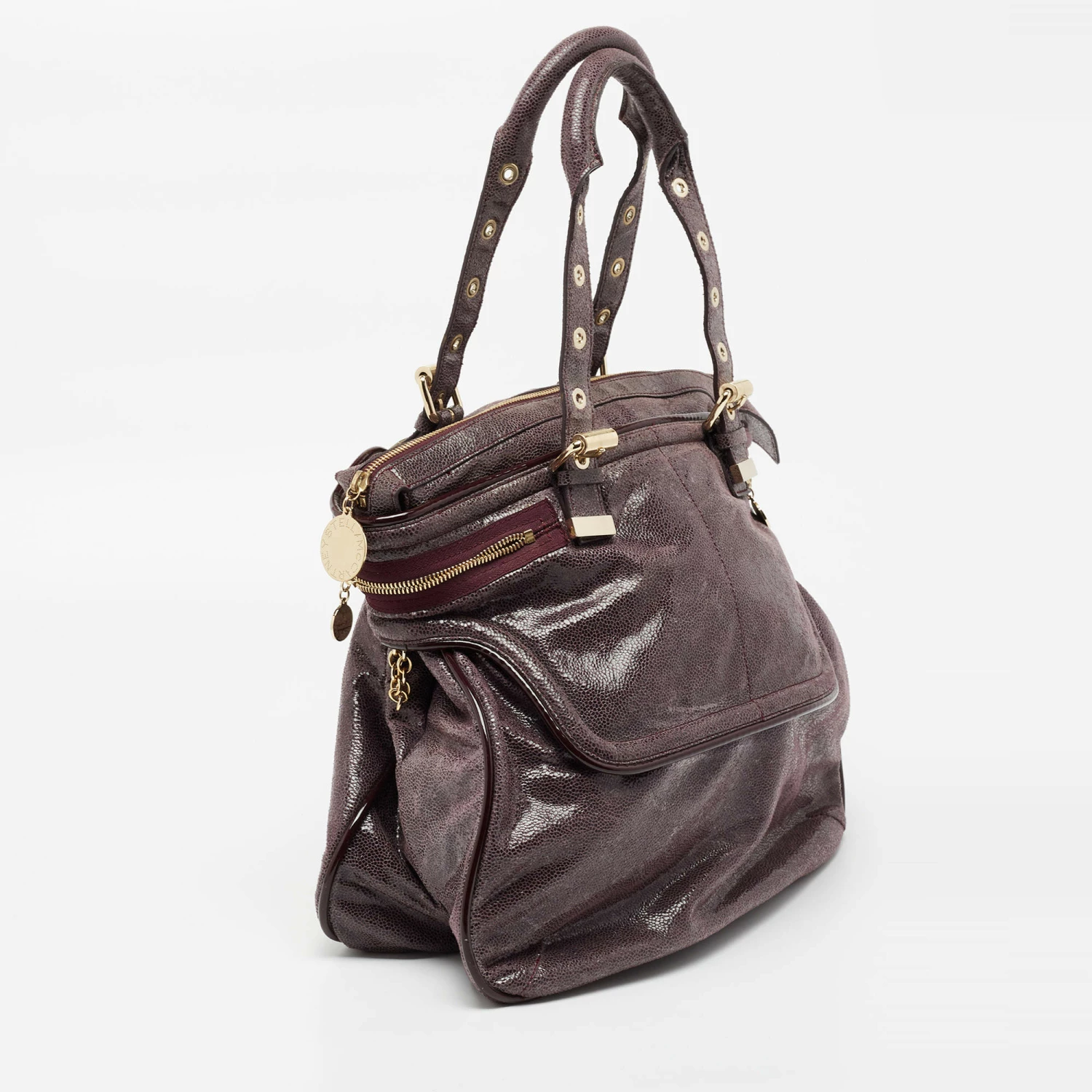 Complete your elegant looks with this lovely purple Stella McCartney tote made with faux suede and patent leather. It features a fabric interior, a detachable zip pouch, and stylish dual handles, making it ideal for long travels.