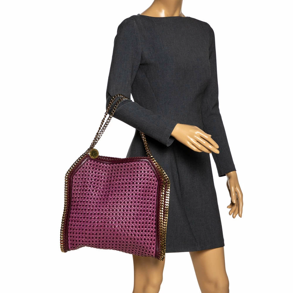 This Falabella shopper tote from Stella McCartney will make the dream of countless women come true. Crafted from woven faux leather, it is durable and stylish. While the chain detailing elevate its beauty, the fabric-lined interior will dutifully hold all your daily essentials. You are sure to make hearts skip when you swing this tote using the chain handles.