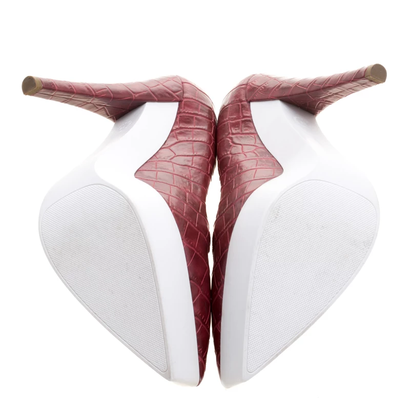 Stella McCartney brings you this pair of stunning pumps that will delight your shoe collection. The pumps carry beautiful croc-embossed exteriors made from faux leather and touched with a red hue. They are complete with contrast platforms, and 14.5 cm heels.