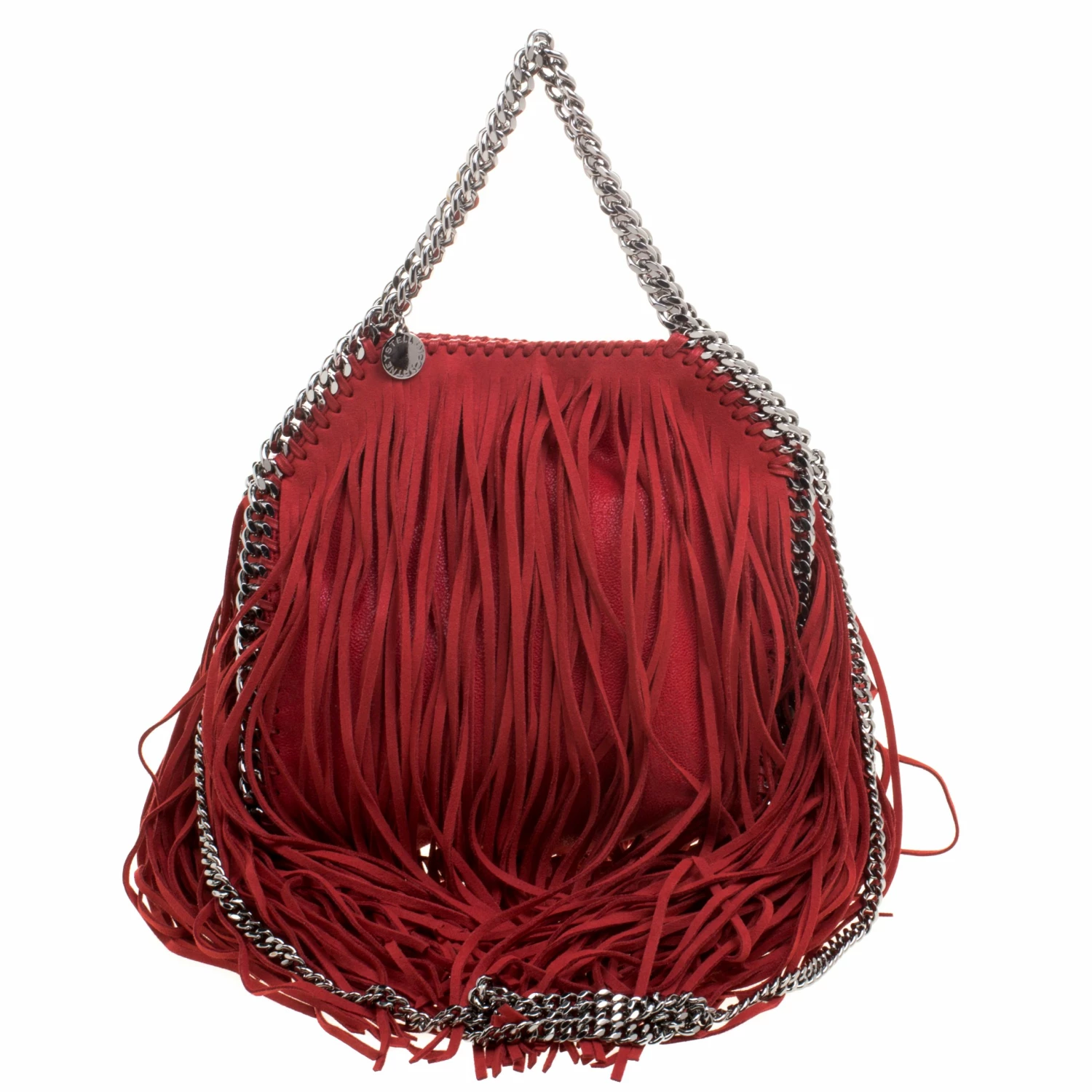 Stella McCartney is known for her chic designs and this mini Falabella fringe tote perfectly embodies this trait. Crafted in Italy from red faux leather with a fabric interior, this bag has a beautiful allover fringe exterior and silver tone chain details at its contours and as handles. This bag can be carried with your everyday outfits.