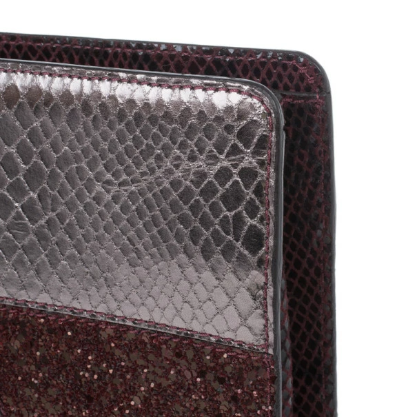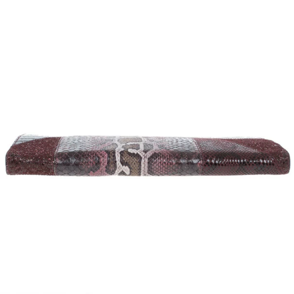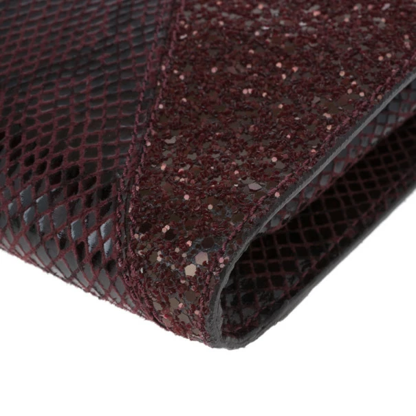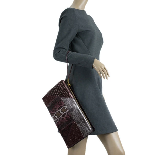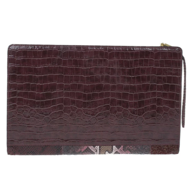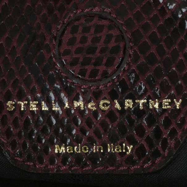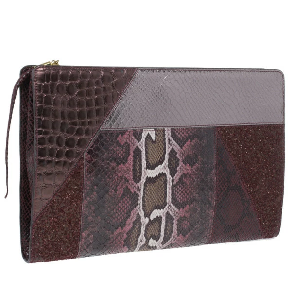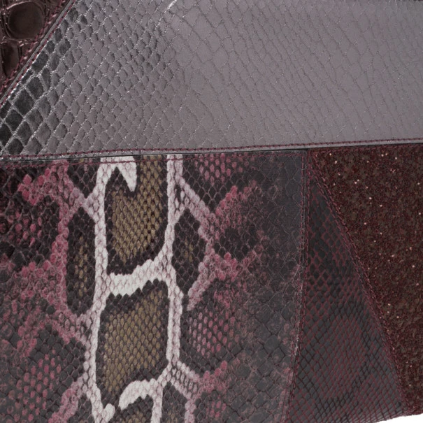 A stunning plum color, this Stella McCartney clutch Β is a must have! Its faux leather exterior is patched, creating an exotic look with different types of leather. Its top zip closure is coupled with a wristlet and includes gold-tone hardware. Lined with monogrammed canvas, it also includes magnetic closure on its sides.Original Retail Price: USΒ $1,120