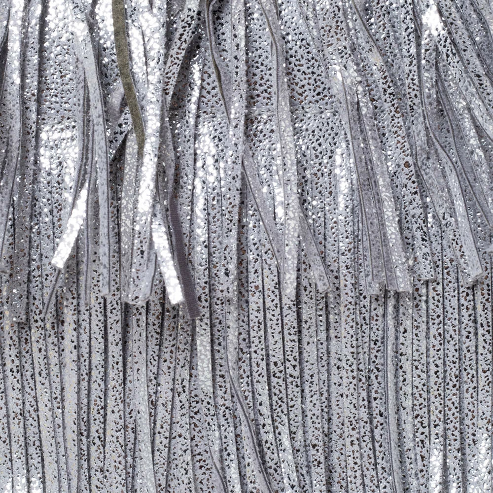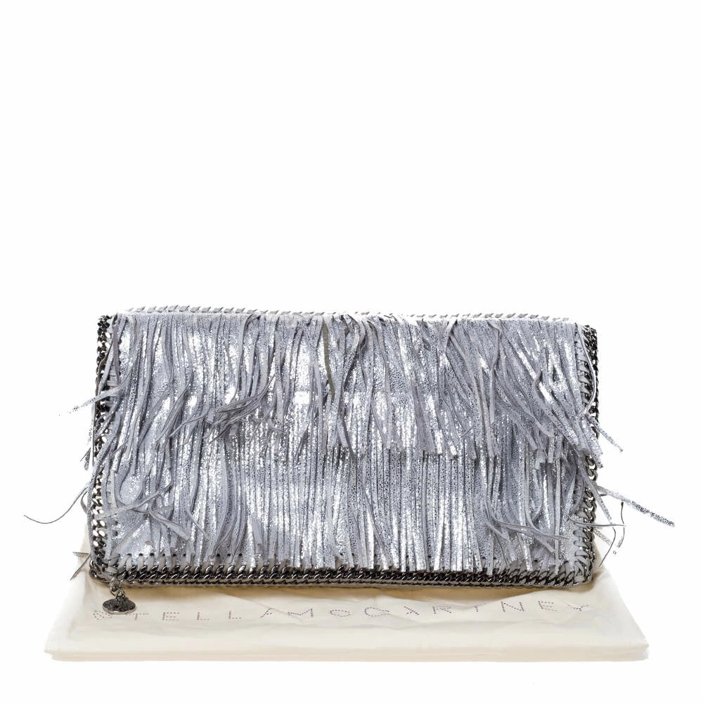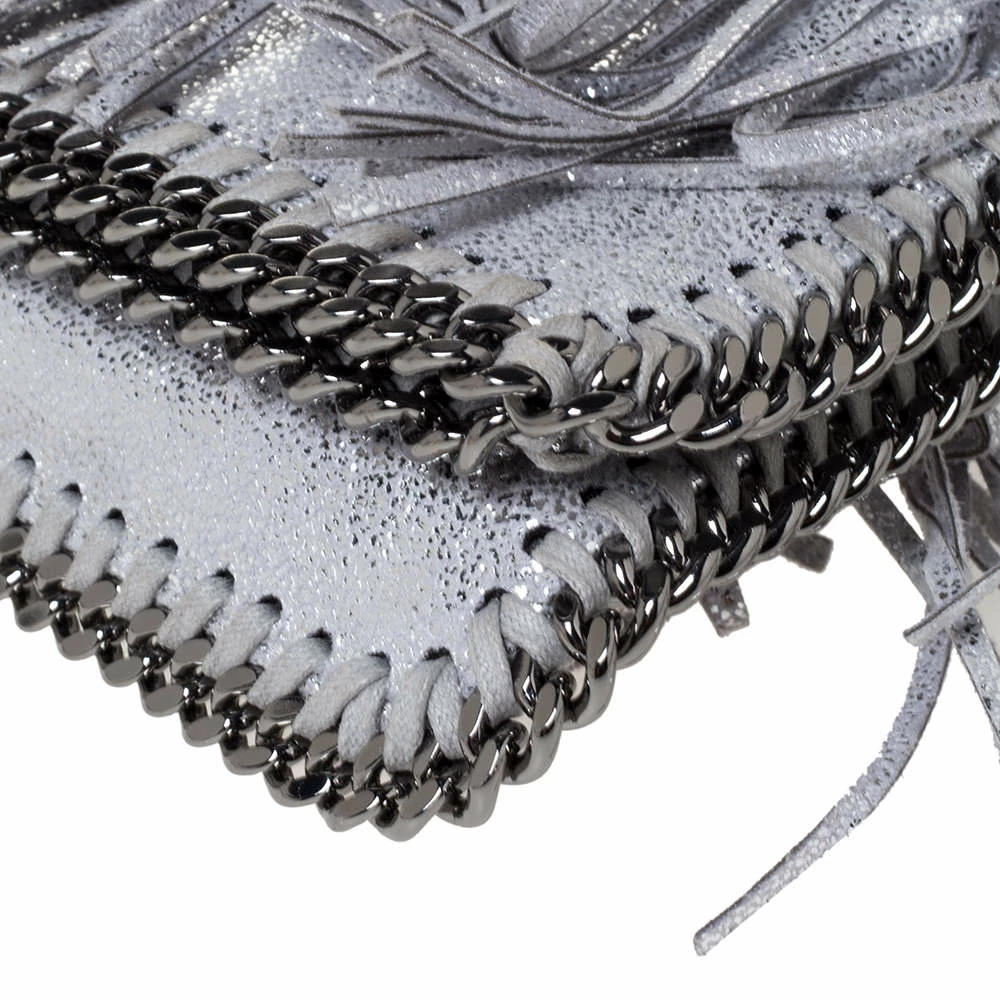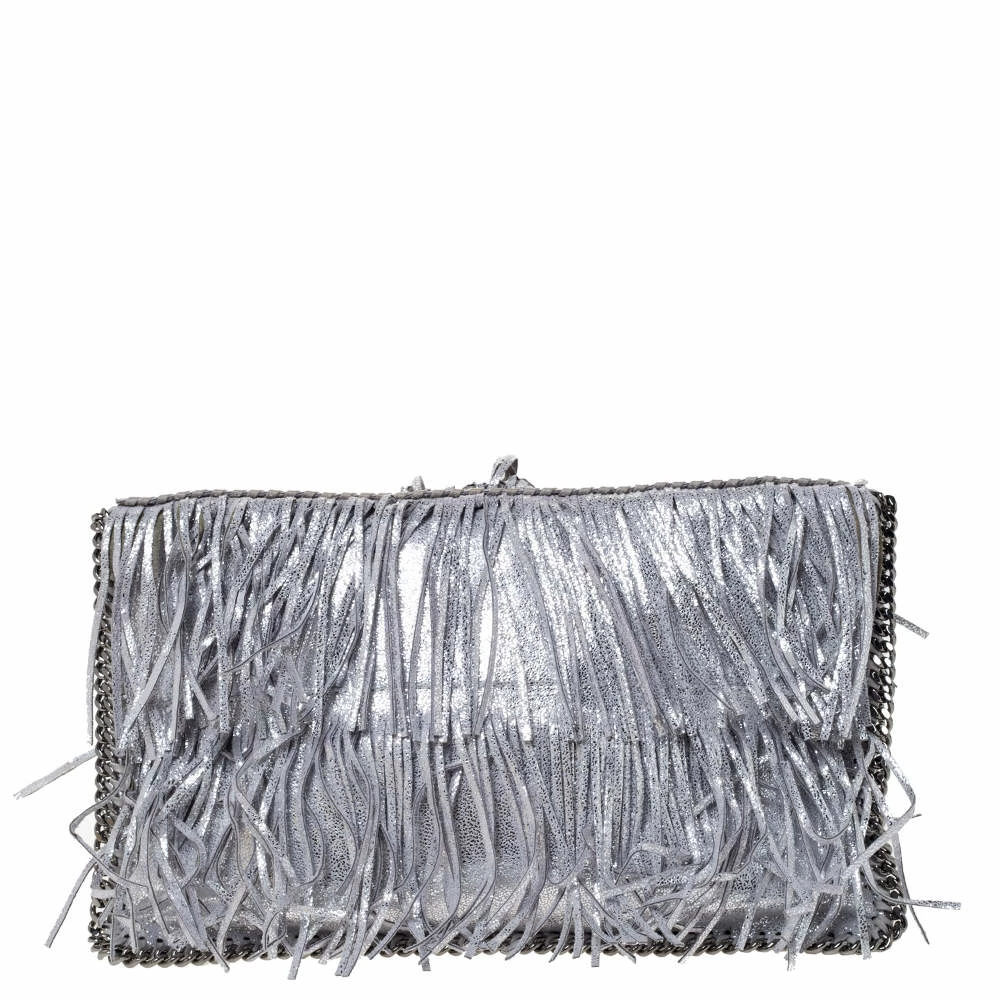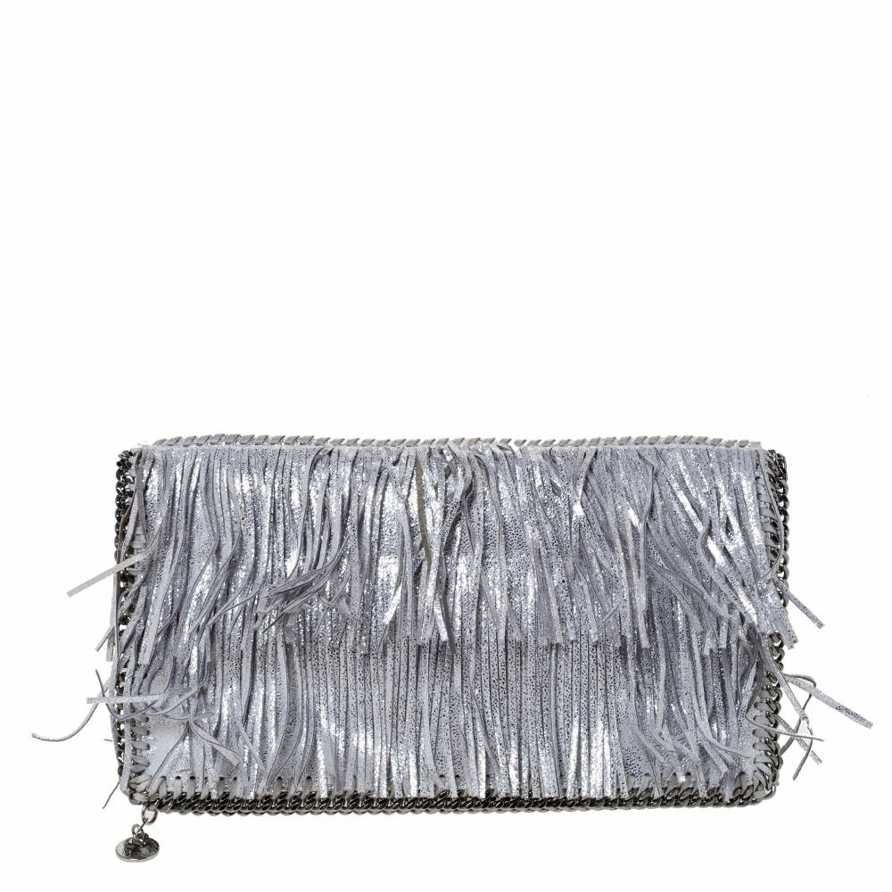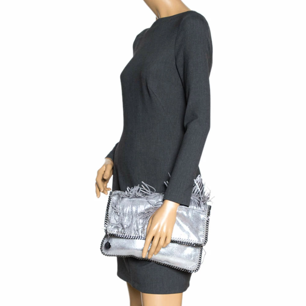 Stella McCartney is known for her modern yet elegant designs and this Falabella fold-over clutch perfectly embodies this trait. Crafted in Italy from faux leather with a nylon interior, this clutch has a beautiful fringed silver exterior and silver-tone chain details at its contours. It also comes with the signature logo-engraved charm as the zipper pull. This piece can be carried with all your chic outfits.