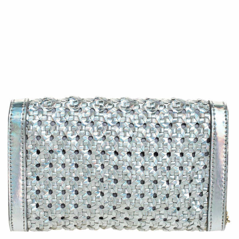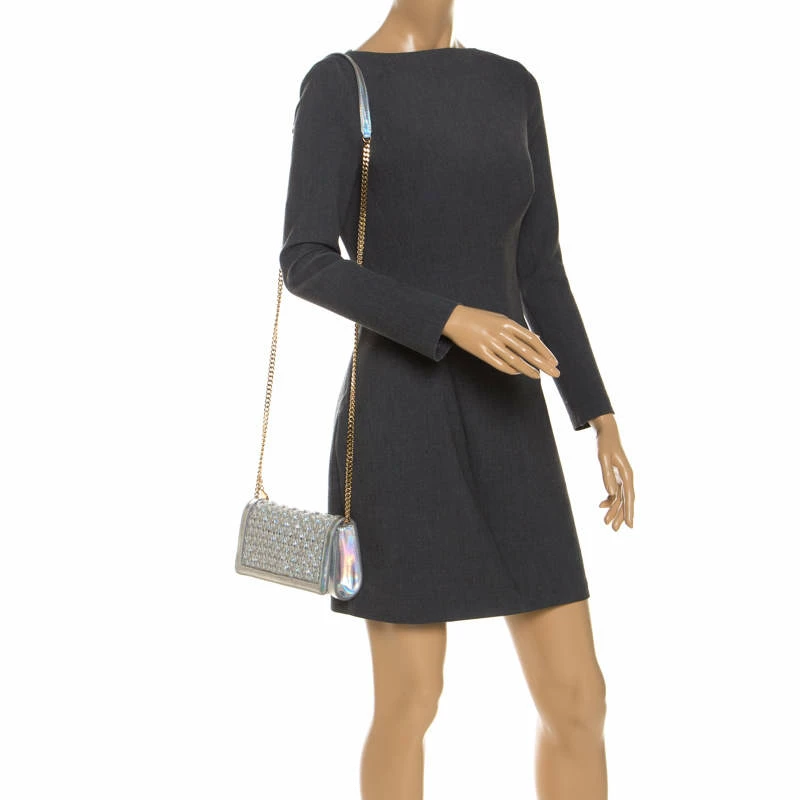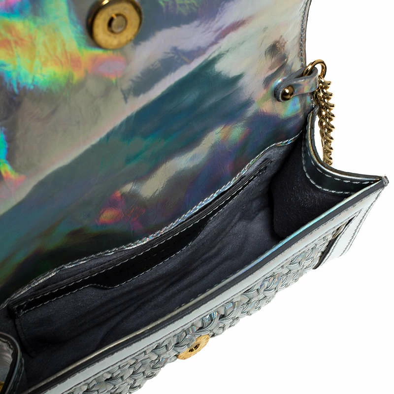 This Stella McCartney handbag is simply stunning. Crafted to deliver glamour and style, it is made from silver holographic leather. Its exterior features a lovely woven detail, a front flap that opens to a luxurious suede-lined interior wit enough space to house your party essentials, and a leather and chain shoulder strap. The bag is impeccably finished with gold-tone hardware. Grab this beauty now.