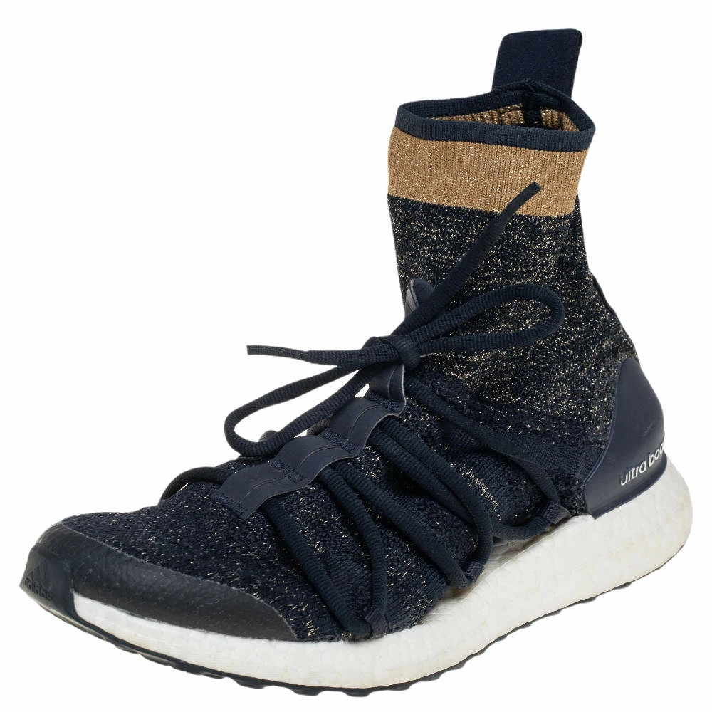 These high-top kicks are designed by Stella McCartney for adidas. Crafted from lurex knit in a blue shade, the materials employed to create these sneakers are ethically sourced. They feature a sock-like silhouette, laces on the vamps, and sturdy soles.