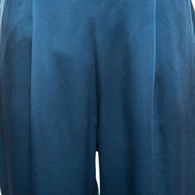 Stella McCartney’s pretty teal trousers are designed with wide legs. They are crafted with a blend of fabrics. The easing silhouette of these trousers makes them a comfortable piece of clothing which, when paired with a fitted blouse, gives you a chic evening look.