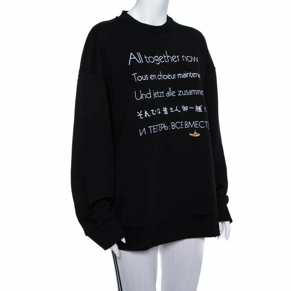 Stella McCartney’s ‘All Together Now’ sweatshirt is inspired by The Beatles’ Yellow Submarine relaunchโdepicted on the label of the creation. Made using cotton, the sweatshirt has long sleeves with dropped shoulders and the words ‘All together now’ listed in multiple languages on the front, as an idea of uniting the world.