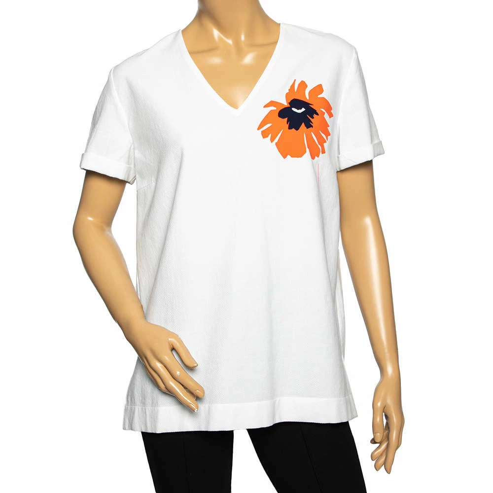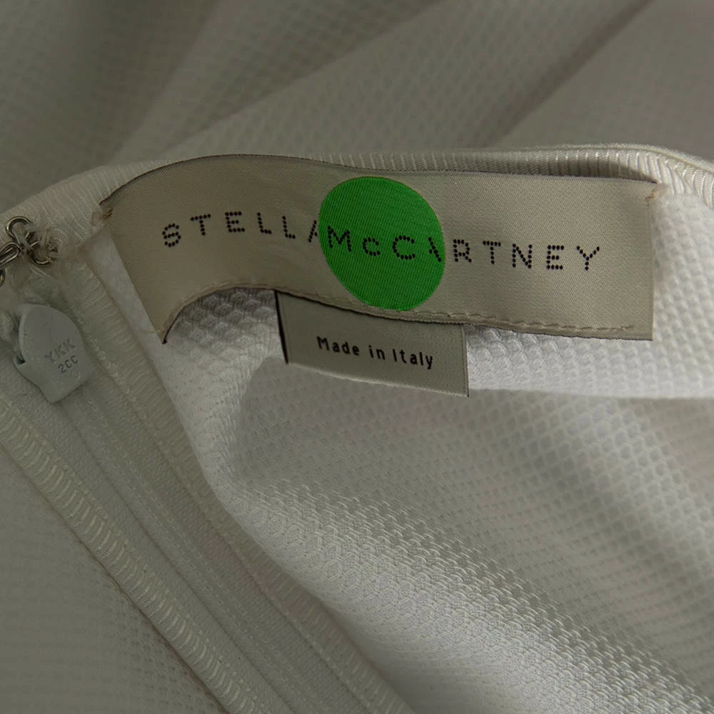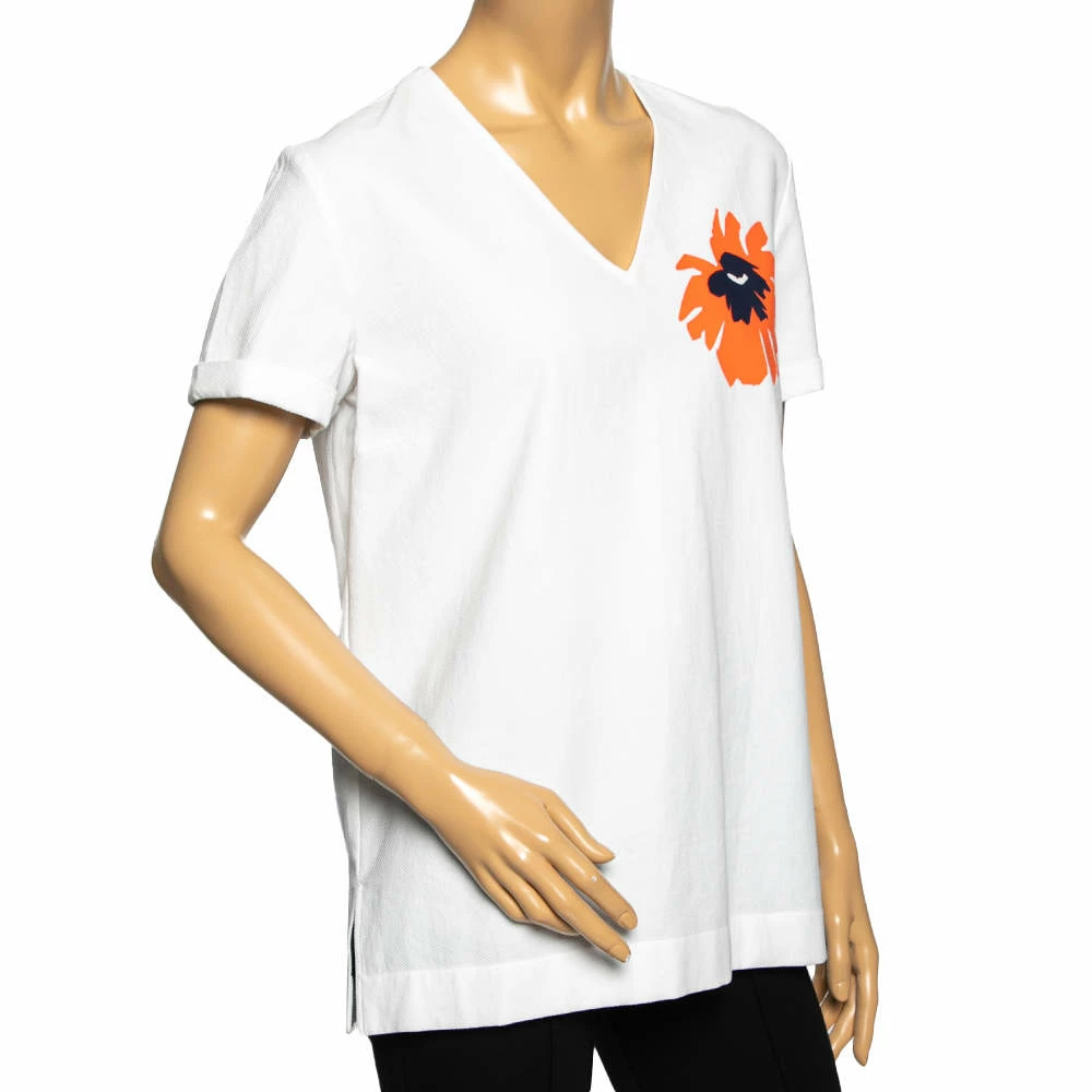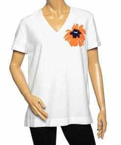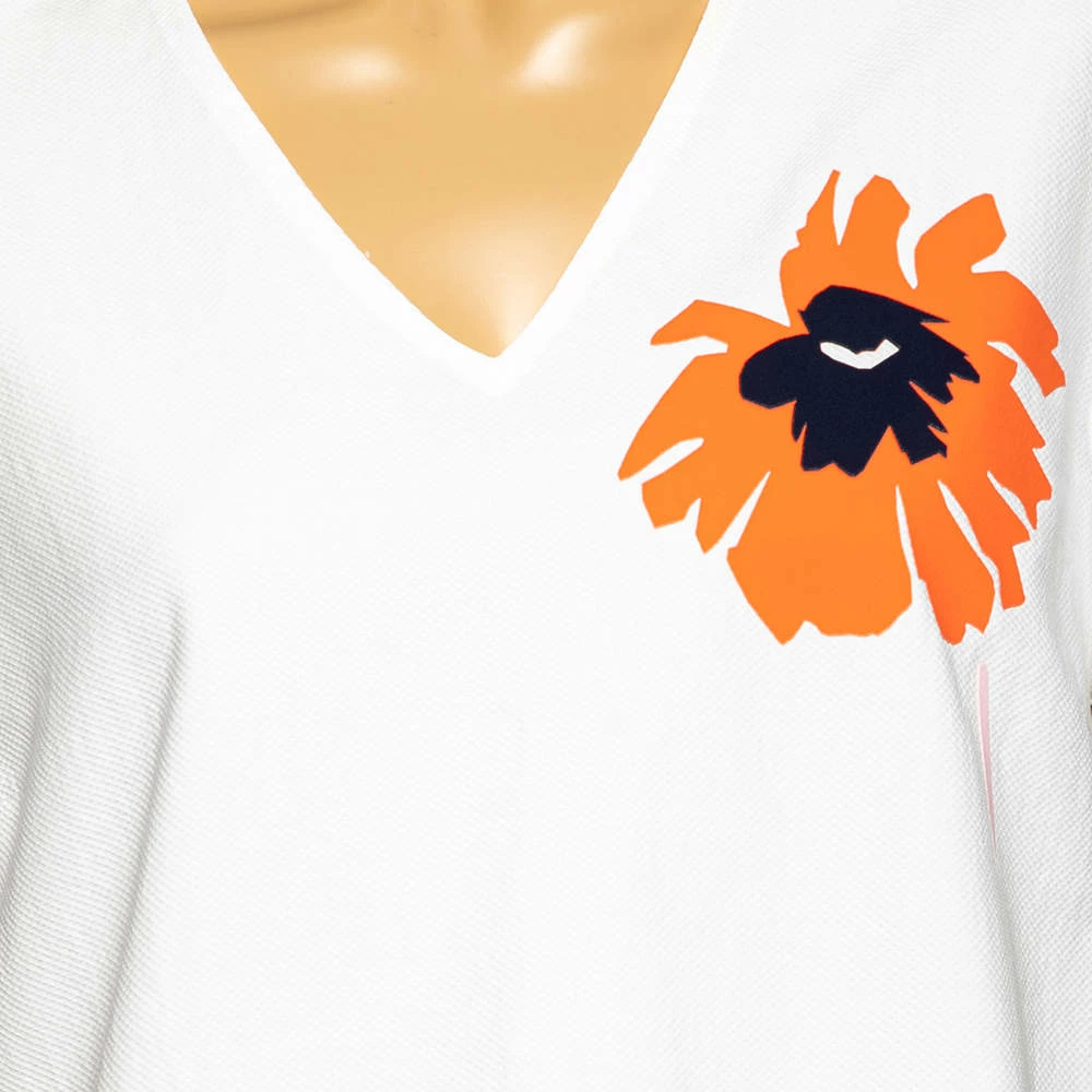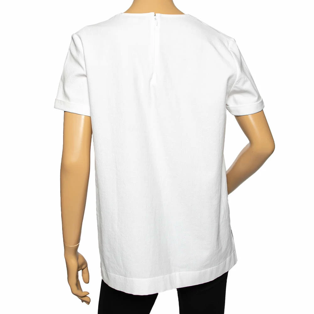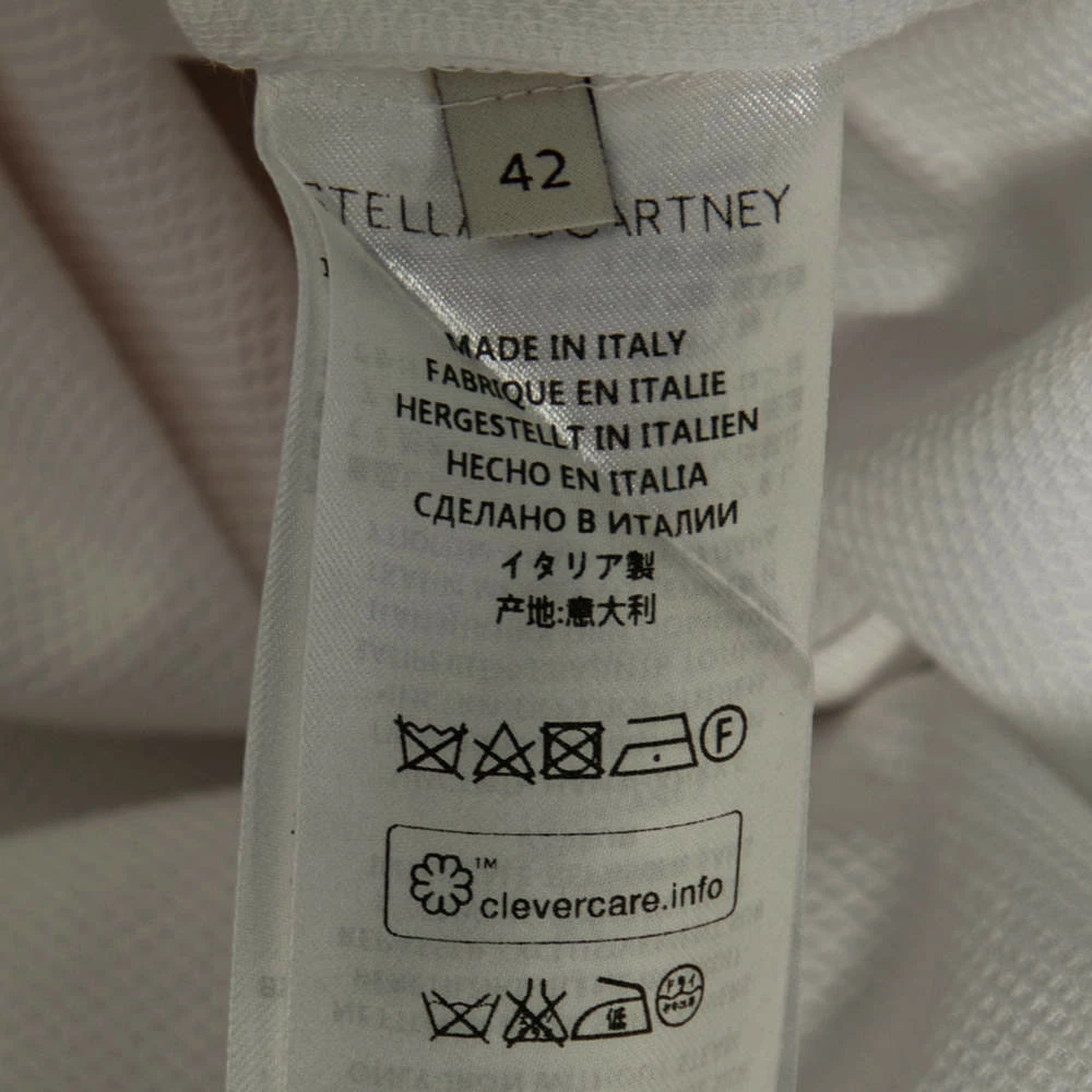 Stay comfortable and stylish all day as you wear this top from the House of Stella McCartney. It is tailored using white cotton fabric, with a multicolored embroidered patch highlighting the front. It features short sleeves, a V-shaped neckline, and a zip fastening at the back.