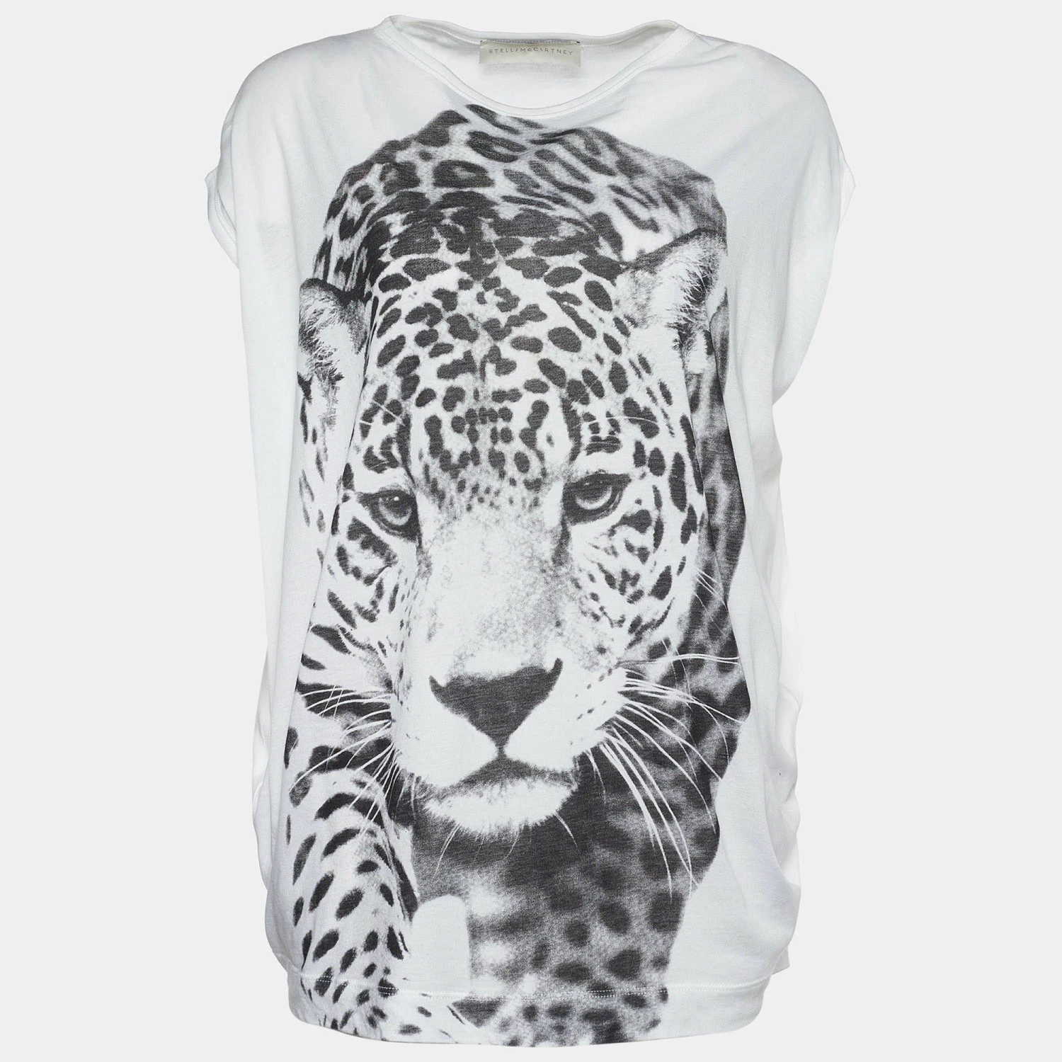 From the House of Stella McCartney comes this top to elevate your style and make you look gorgeous. It is tailored using white cotton fabric, which is highlighted with a leopard print on the front. It has a sleeveless style. Look your stylish best in this creation.
