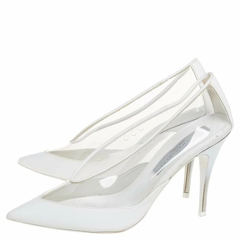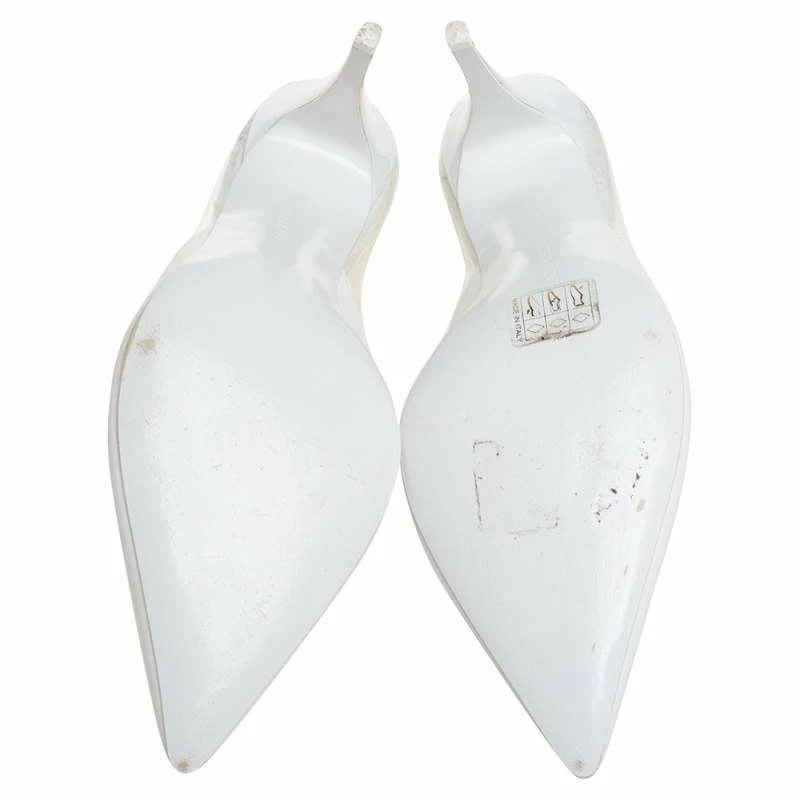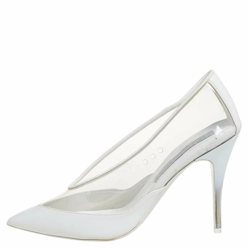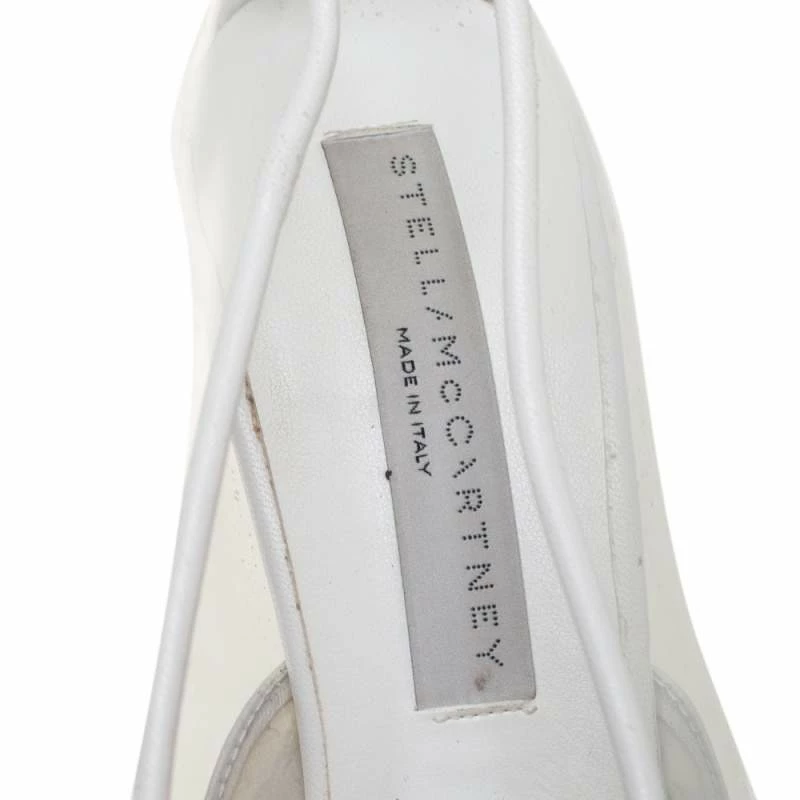 Simplicity and sophistication take center stage in these white pumps from Stella McCartney! They have been crafted from faux leather and PVC and feature pointed toes and U-shaped vamps. They come equipped with comfortable insoles and stand tall on 10.5 cm heels.