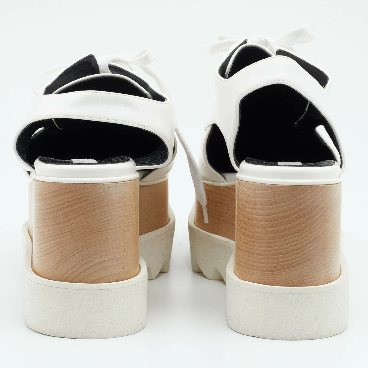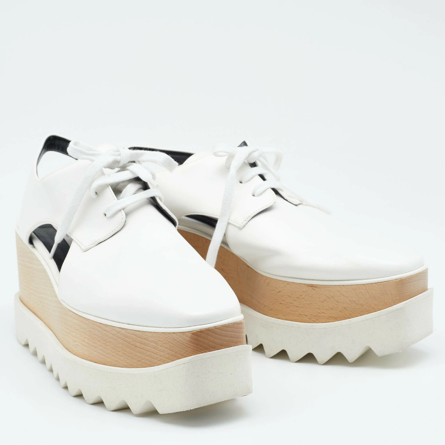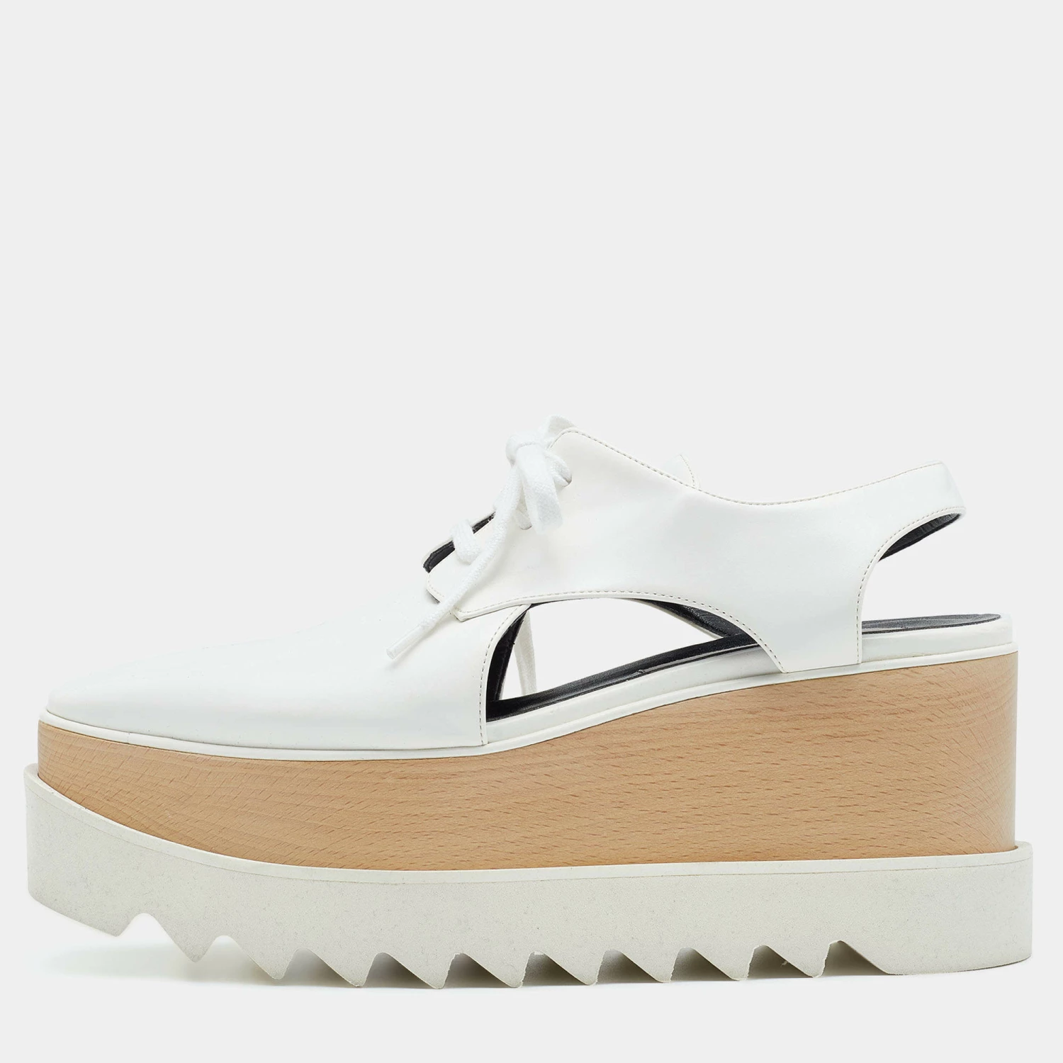 The unique silhouette of this pair of Stella McCartney derby makes it highly fashionable and chic. Constructed from faux leather, it is made striking with attractive cutouts and flaunts platforms, rubber soles, and 9cm heels.