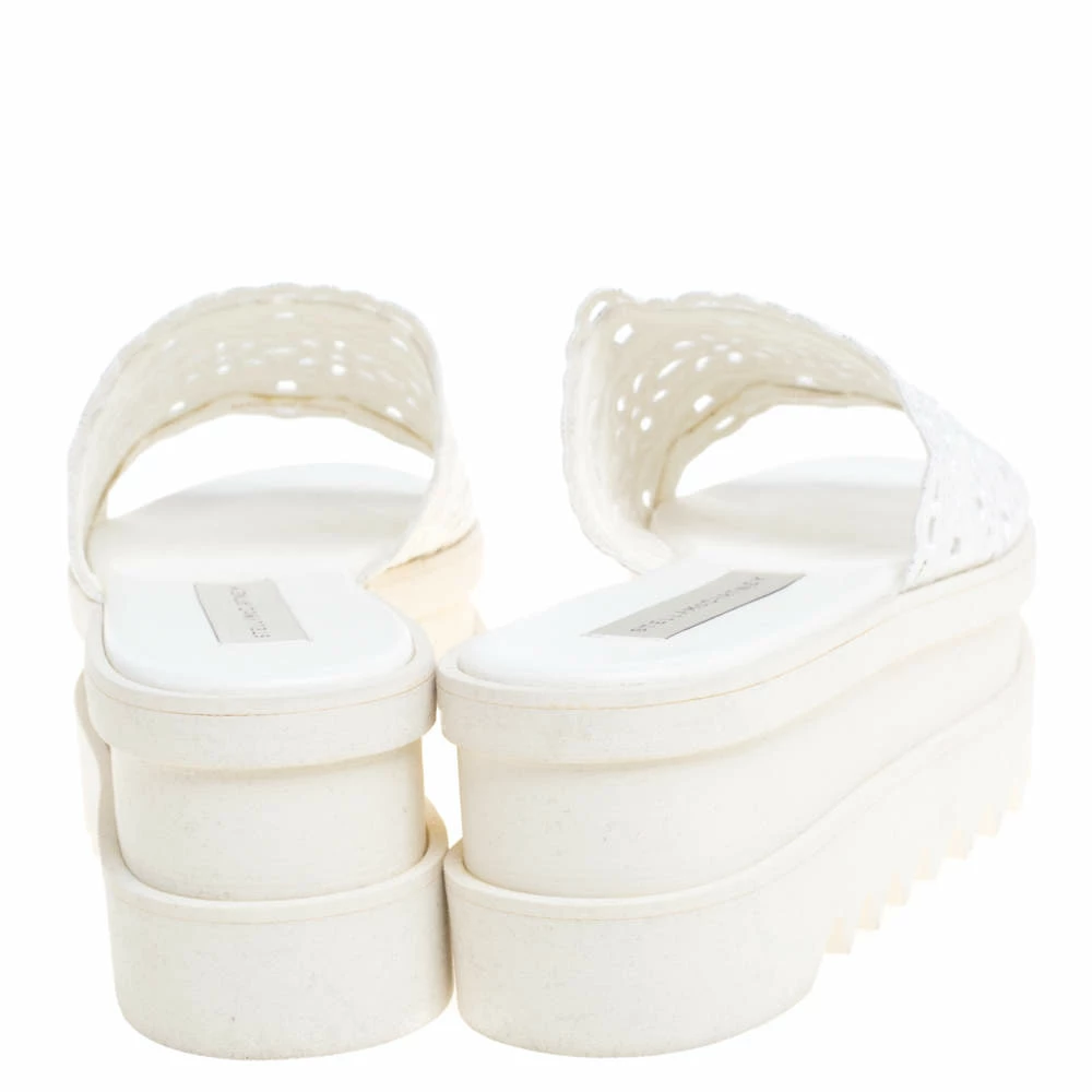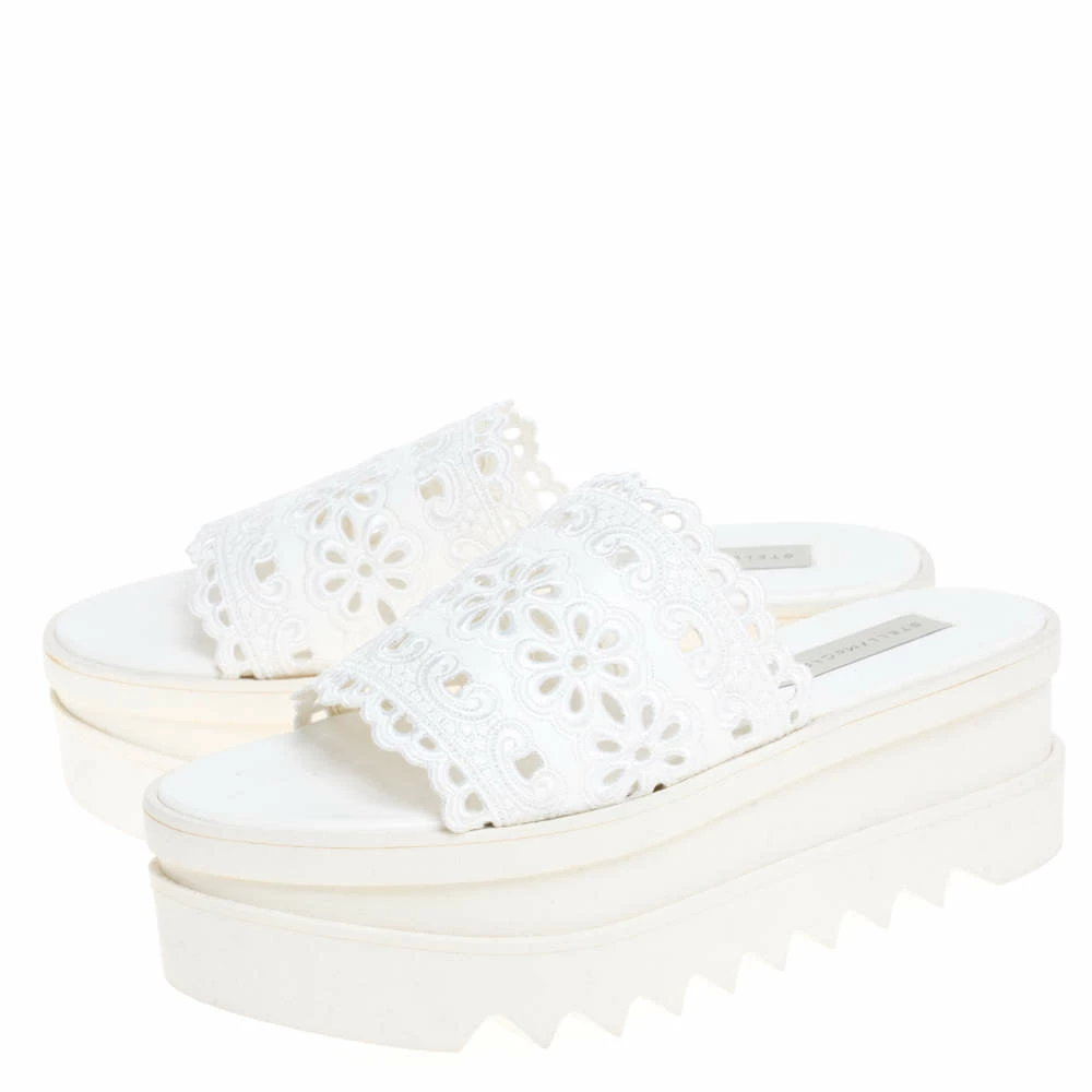 Comfort and fashion join hands to bring to you these fabulous slides from Stella McCartney! The white slides are crafted from faux leather and feature an open toe silhouette. They flaunt lace-cut brocade detailing on the vamps and are raised on 6.5 cm solid platforms that offer maximum grip. Grab them right away and add sparks of luxury to your wardrobe!