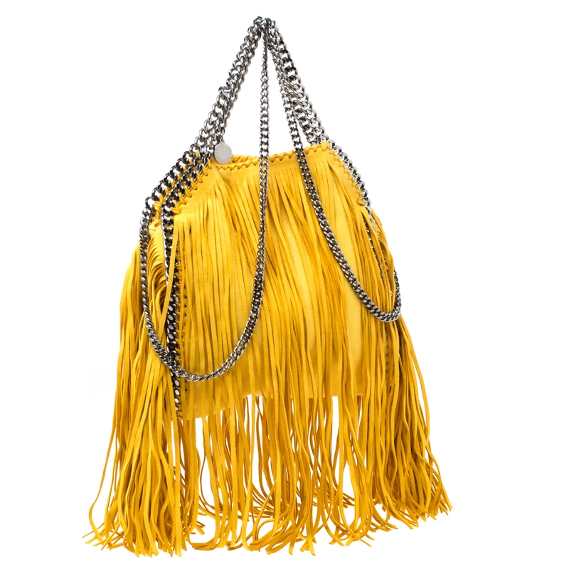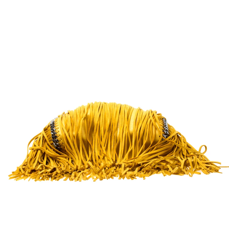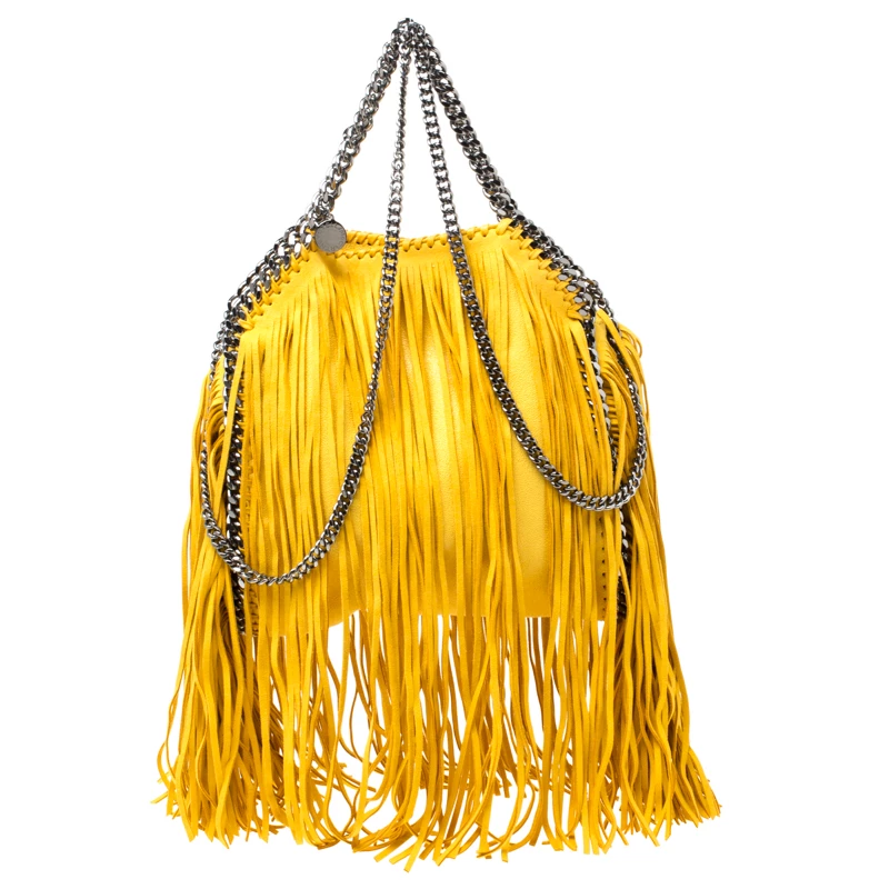 Stella McCartney is known for her chic designs and this mini Falabella fringe tote perfectly embodies this trait. Crafted in Italy from yellow faux leather with a fabric interior, this bag has a beautiful allover fringe exterior and black-tone chain details at its contours and as handles. This bag can be carried with your everyday outfits.
